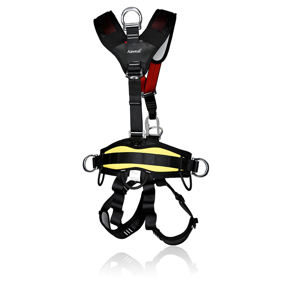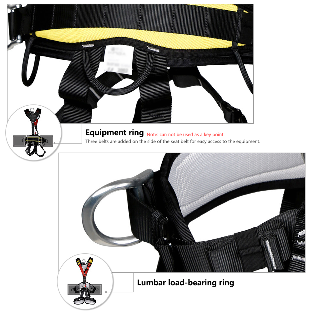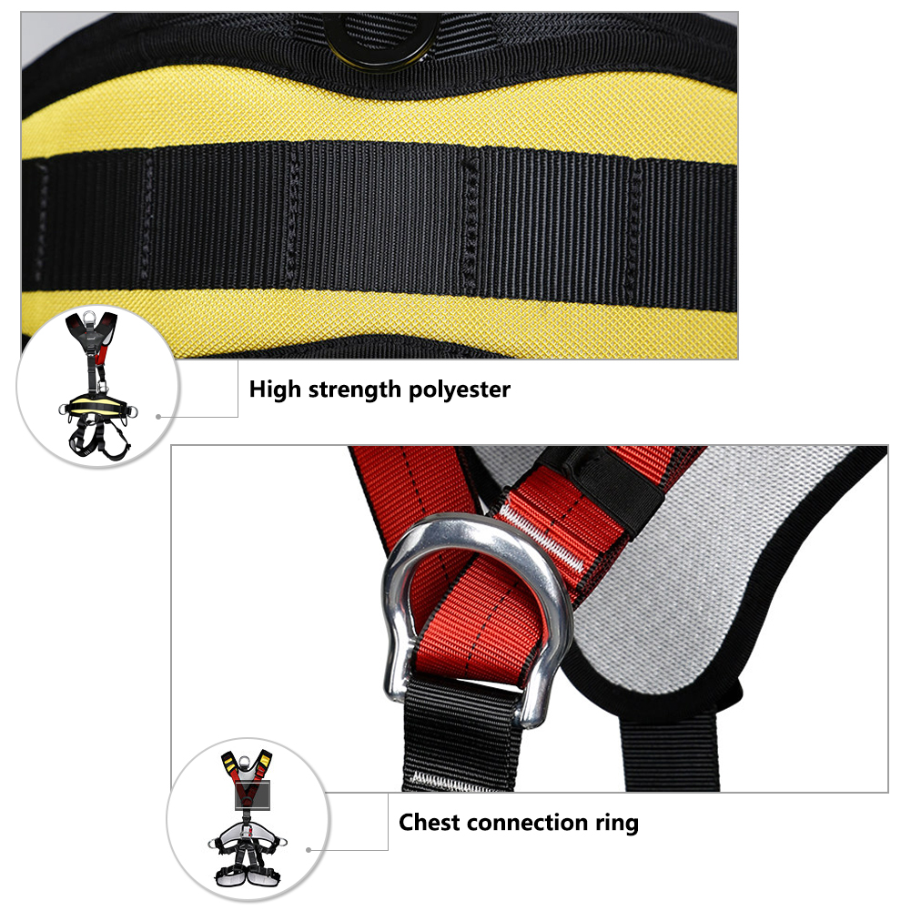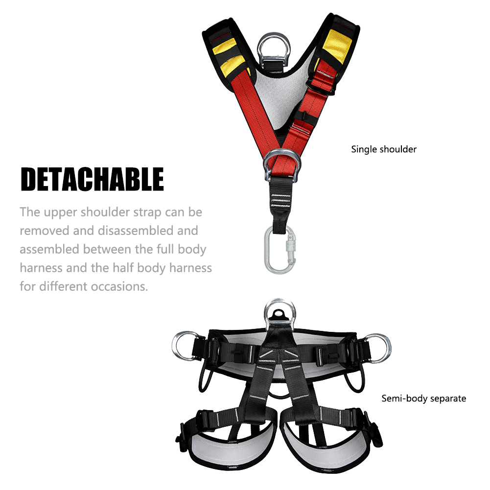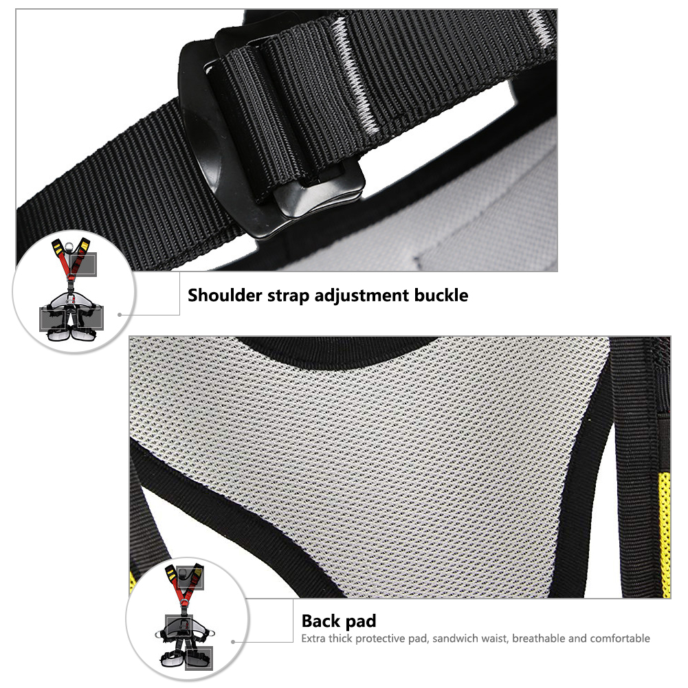 Full Body Safety Rock Tree Climbing Body Fall Protection Rappelling Harness Equipment Gear Shoulder straps for seat harness; Designed for taking the load from the waist belt and redistributing it to the shoulders for improved comfort. Straps connect to the ventral attachment point of the harness and to the two slots at the rear of the waist belt Professional Rock Tree Climbing Fall Protection Safety Harness Carving Equip It can be used to rock climbing, floor escape,rappelling; Working at height,Engineering protection,Rock climbing exploration Static load bearing 15KN Dynamic load 6KN Feature: