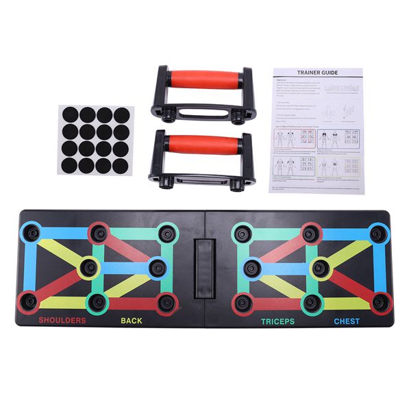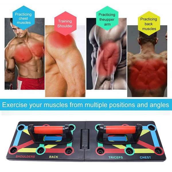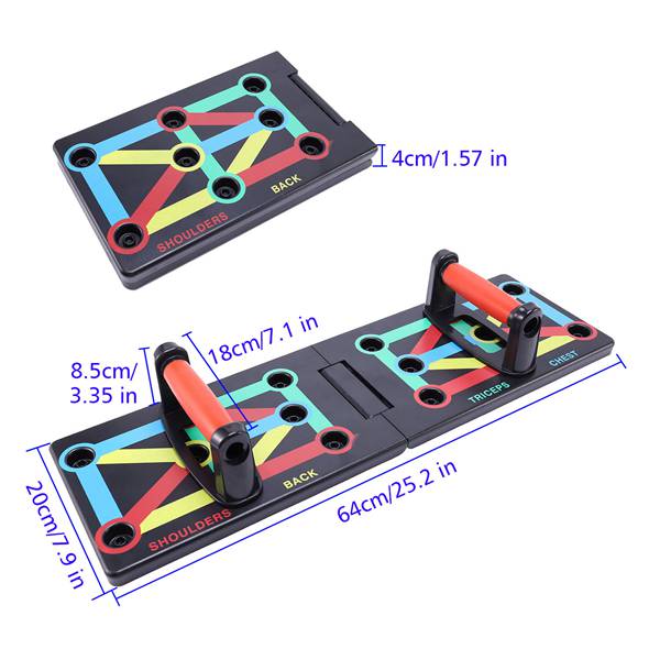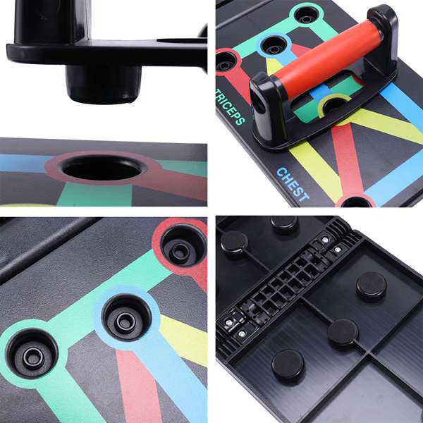 Different color-coded push up board targets specifics muscles worked (Blue-chest, Red-shoulders, Yellow-back, and Green-triceps)
