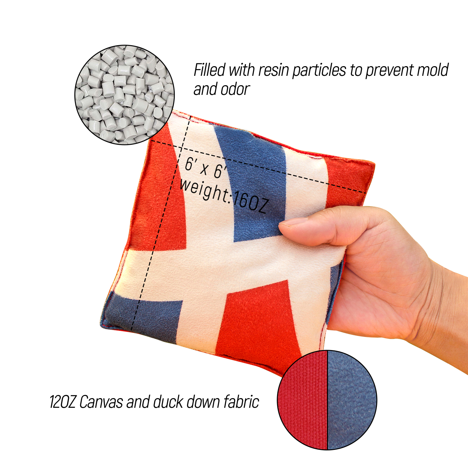 STRONG AND STANDARD BEAN BAGS: Premium duck canvas and microfiber suede make 8 bean bags no fear for all weather, inside resin pellets has no smell, regulation size and weight – 6” x 6” and 15 ounces each