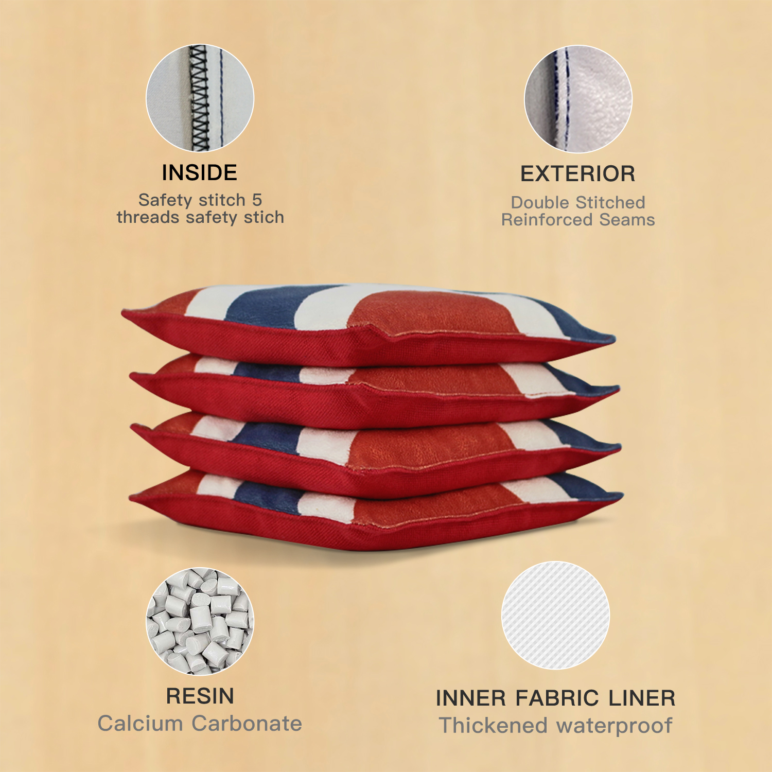 STRONG AND STANDARD BEAN BAGS: Premium duck canvas and microfiber suede make 8 bean bags no fear for all weather, inside resin pellets has no smell, regulation size and weight – 6” x 6” and 15 ounces each
