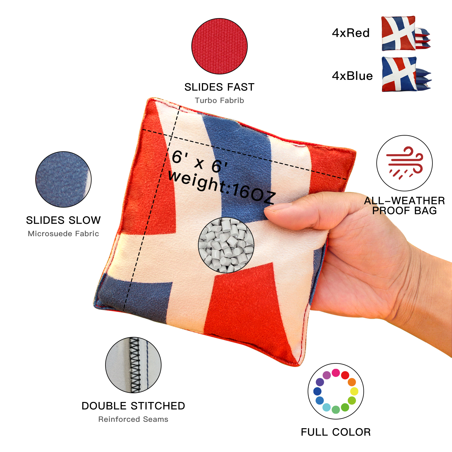 STRONG AND STANDARD BEAN BAGS: Premium duck canvas and microfiber suede make 8 bean bags no fear for all weather, inside resin pellets has no smell, regulation size and weight – 6” x 6” and 15 ounces each