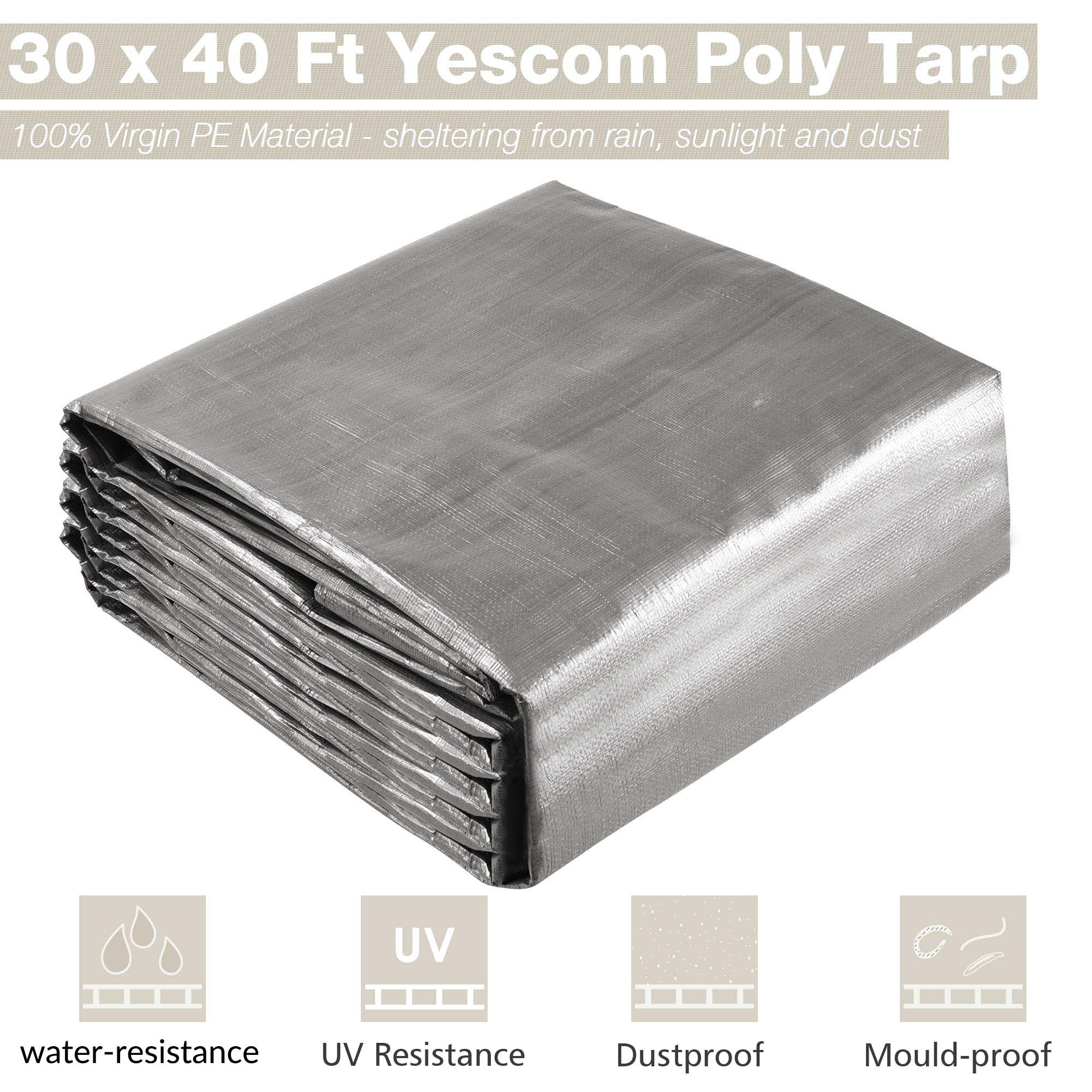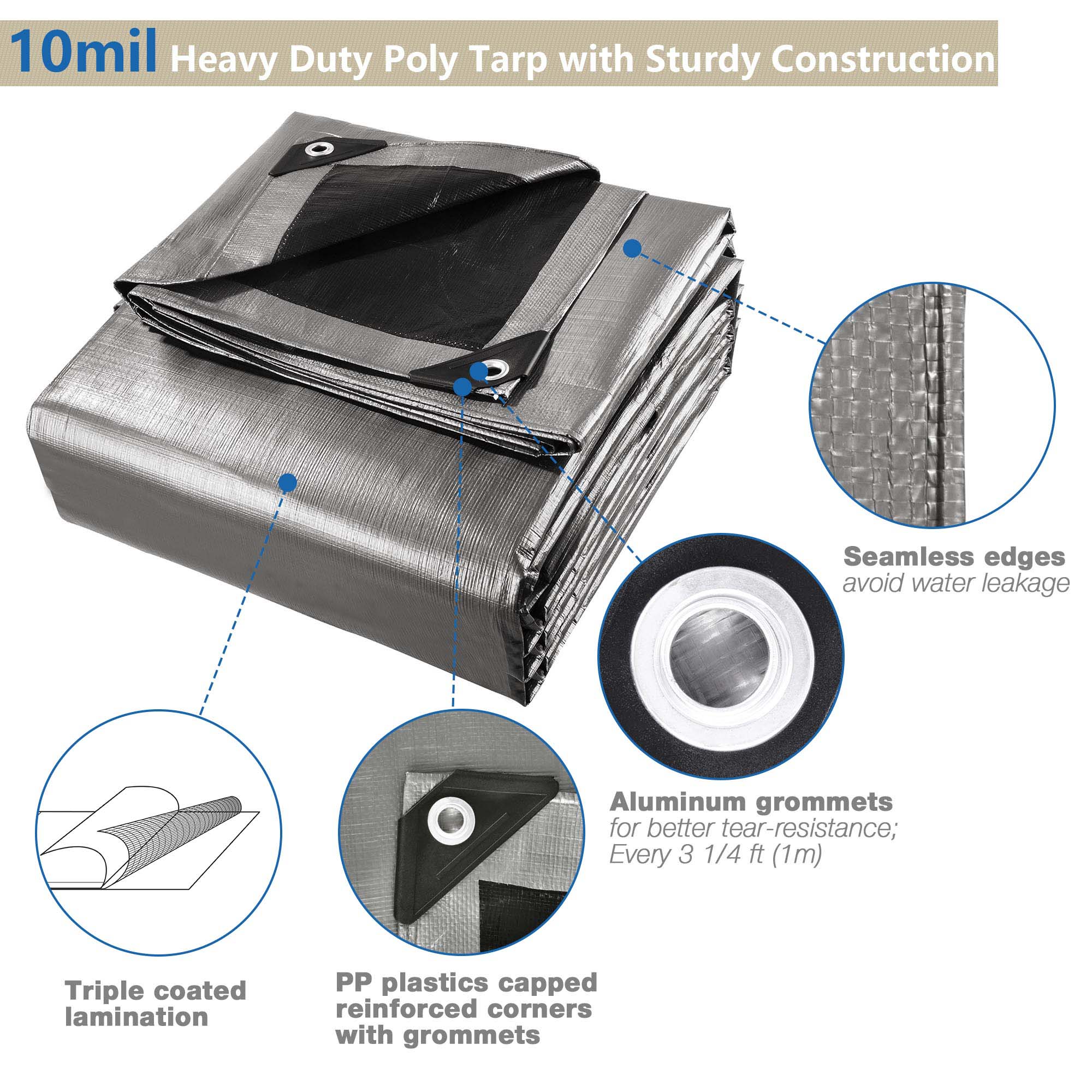 - Heavy Duty Sturdy Poly Tarp - Weights 18.39 kg, 10mil heavy-duty thickness and aluminum grommets in 1m (3 1/4 ft) interval for better tear-resistance; PP plastics capped reinforced corners with grommets for sturdy construction; All seamless edges avoid water leakage