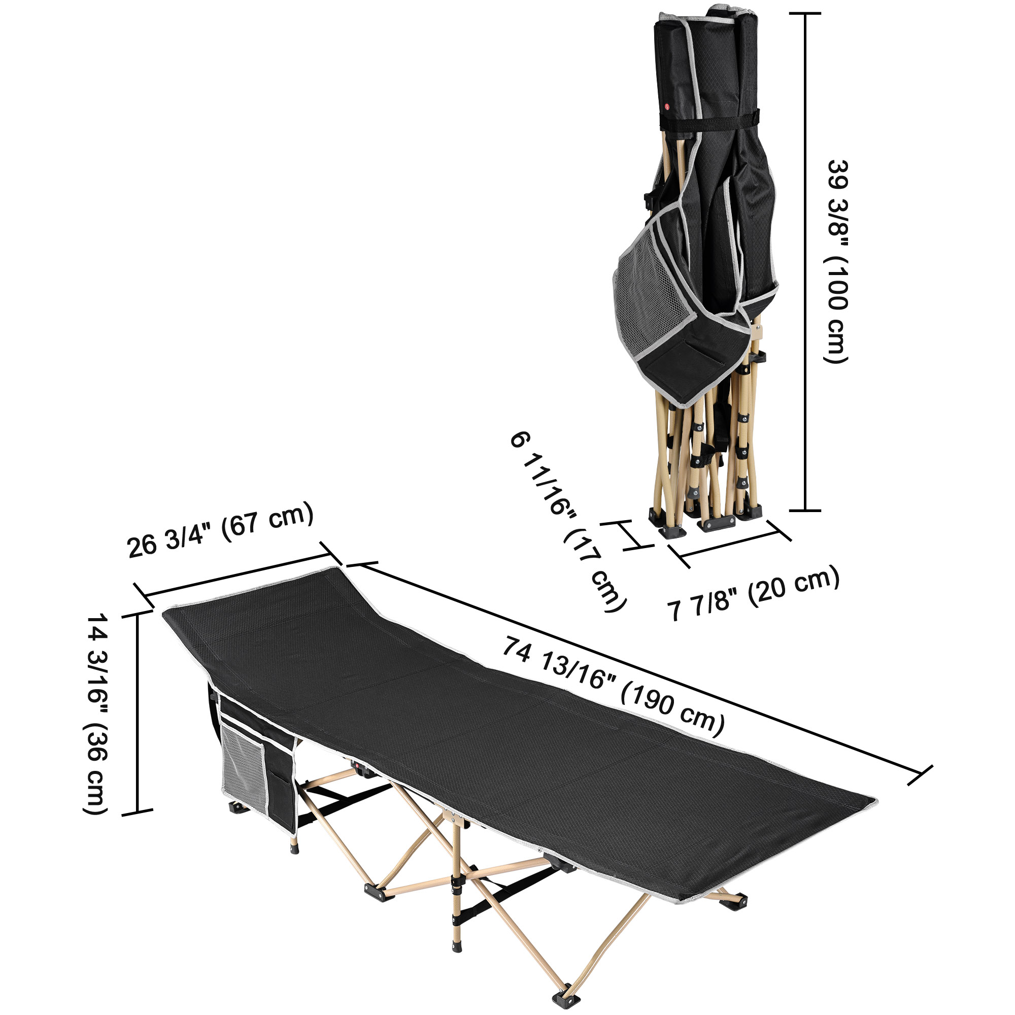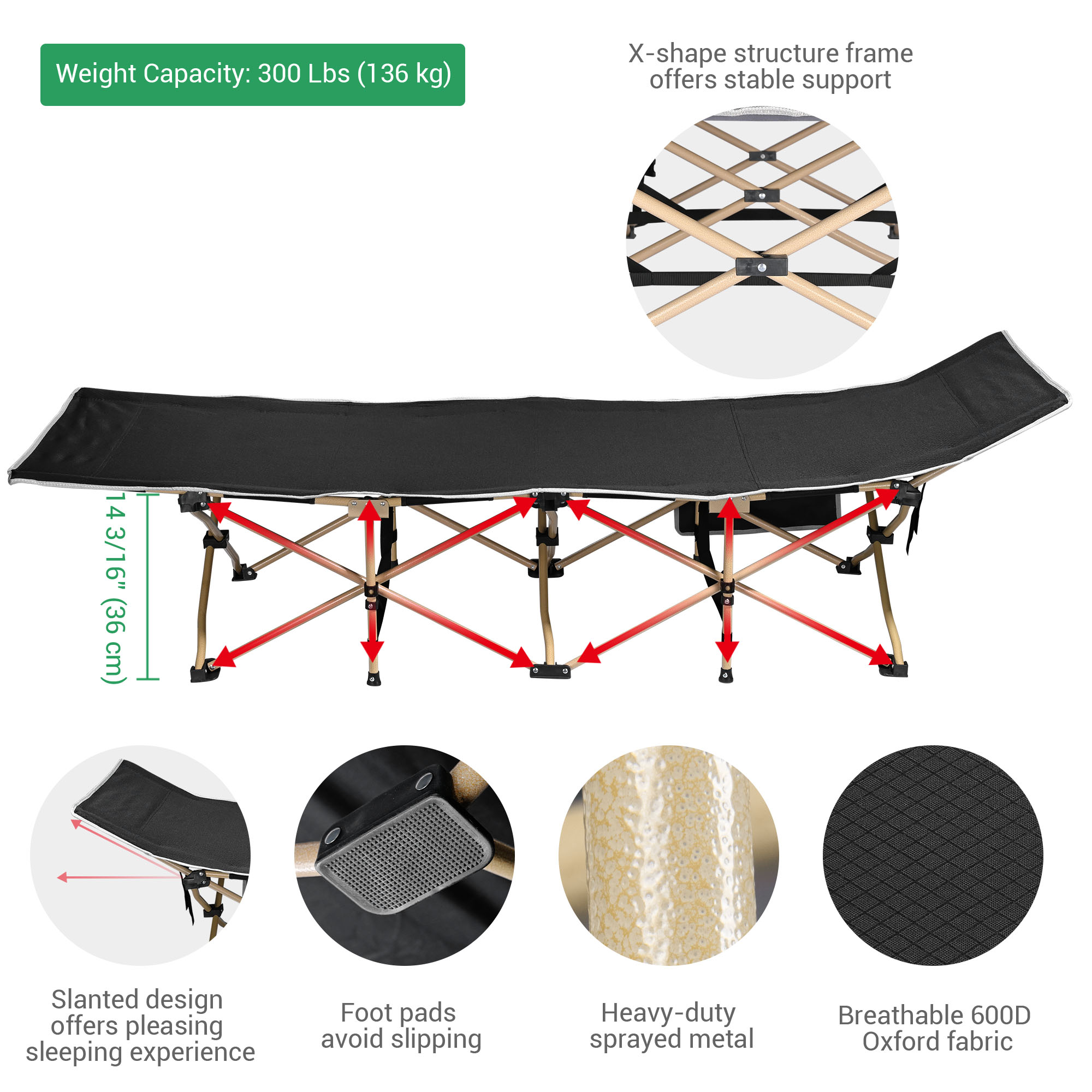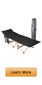 - Comfortable & Convenient - Slanted bed head offers nice sleeping experience; Cot with 14" height above the ground to avoid sleeping on uneven ground & crawlies disturbance; Breathable 600D oxford fabric features tear & wear resistance; with side pockets for holding phone, pad, magazine, flashlight etc.