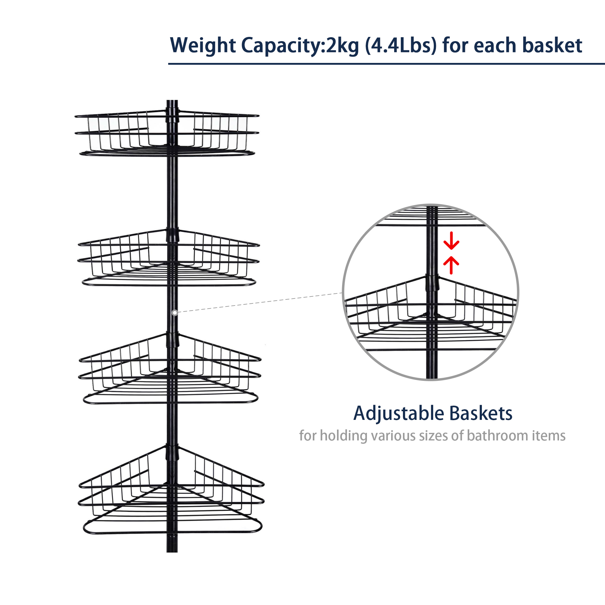 • Adjustable & Versatile Baskets - Baskets on the pole can be freely re-positioned, changing the space between 2 baskets for holding various sizes of bathroom items; Wire baskets also offer better water draining