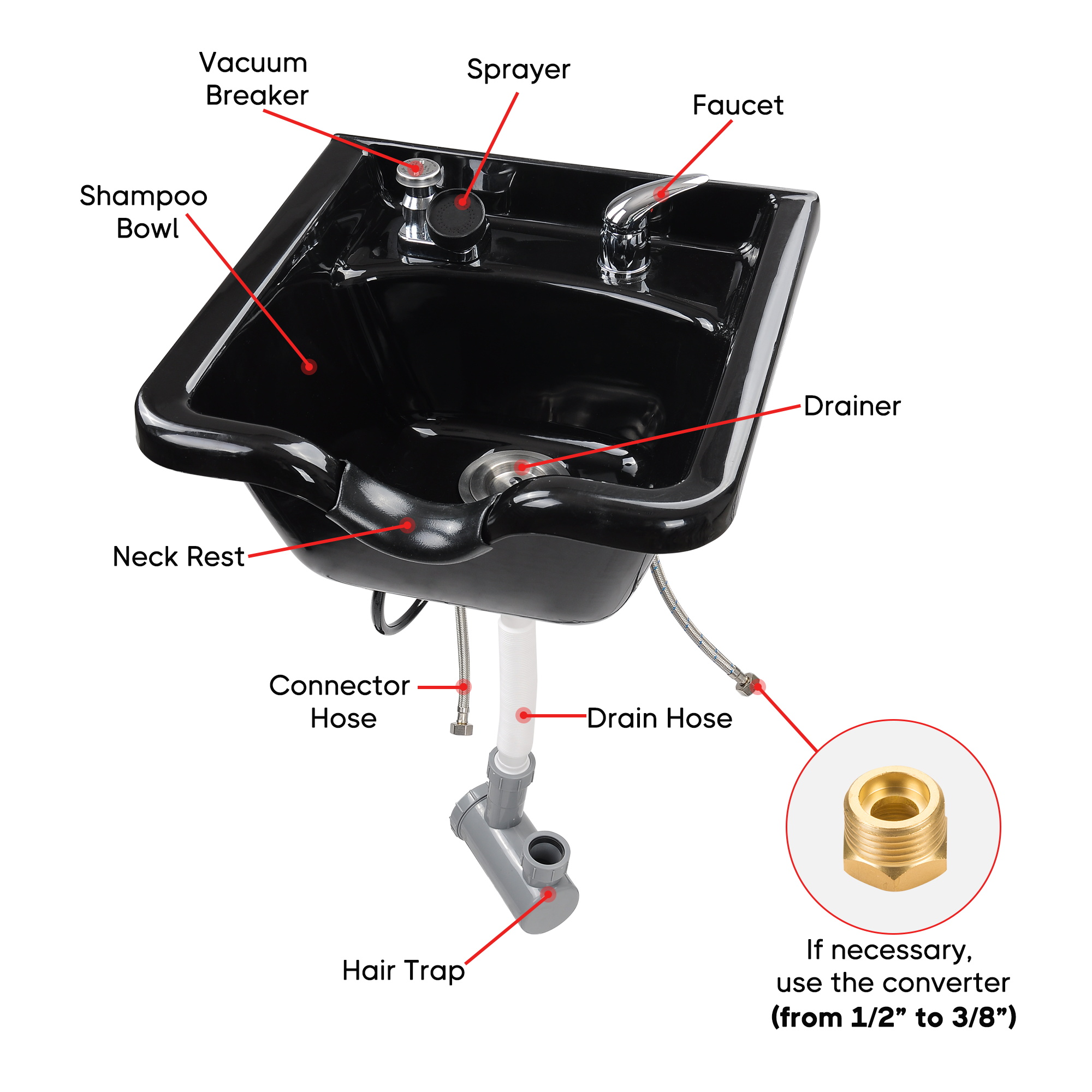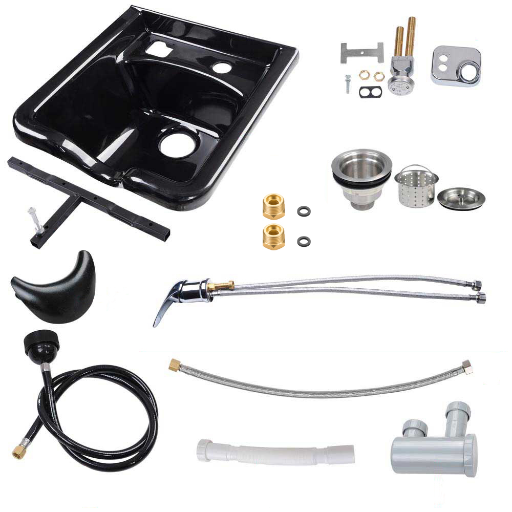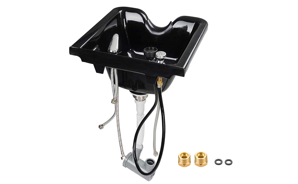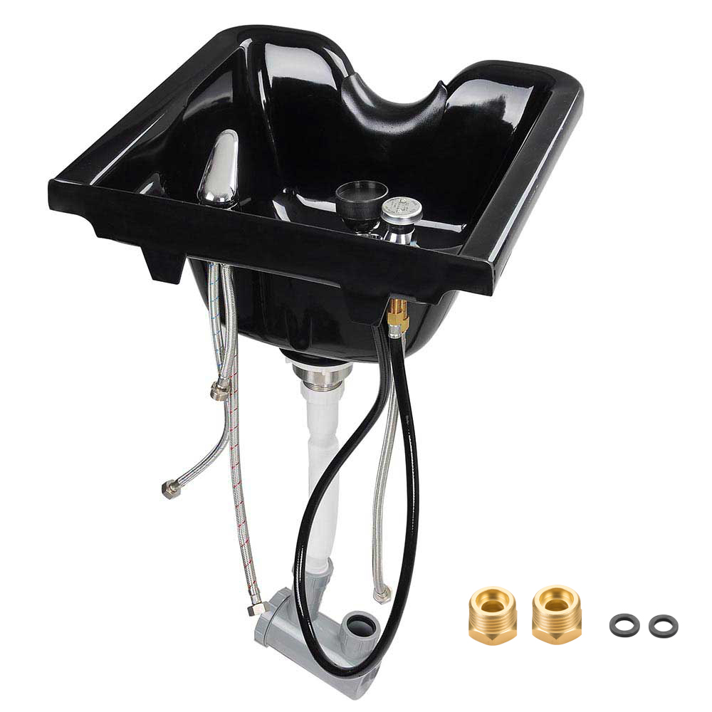 - Easy installation - Shampoo bowl with hair trap and vacuum breaker, can be mounted on walls through T-bar, with 2 convectors for altering 1/2" faucet waterline to 3/8", ideal for using in beauty salon