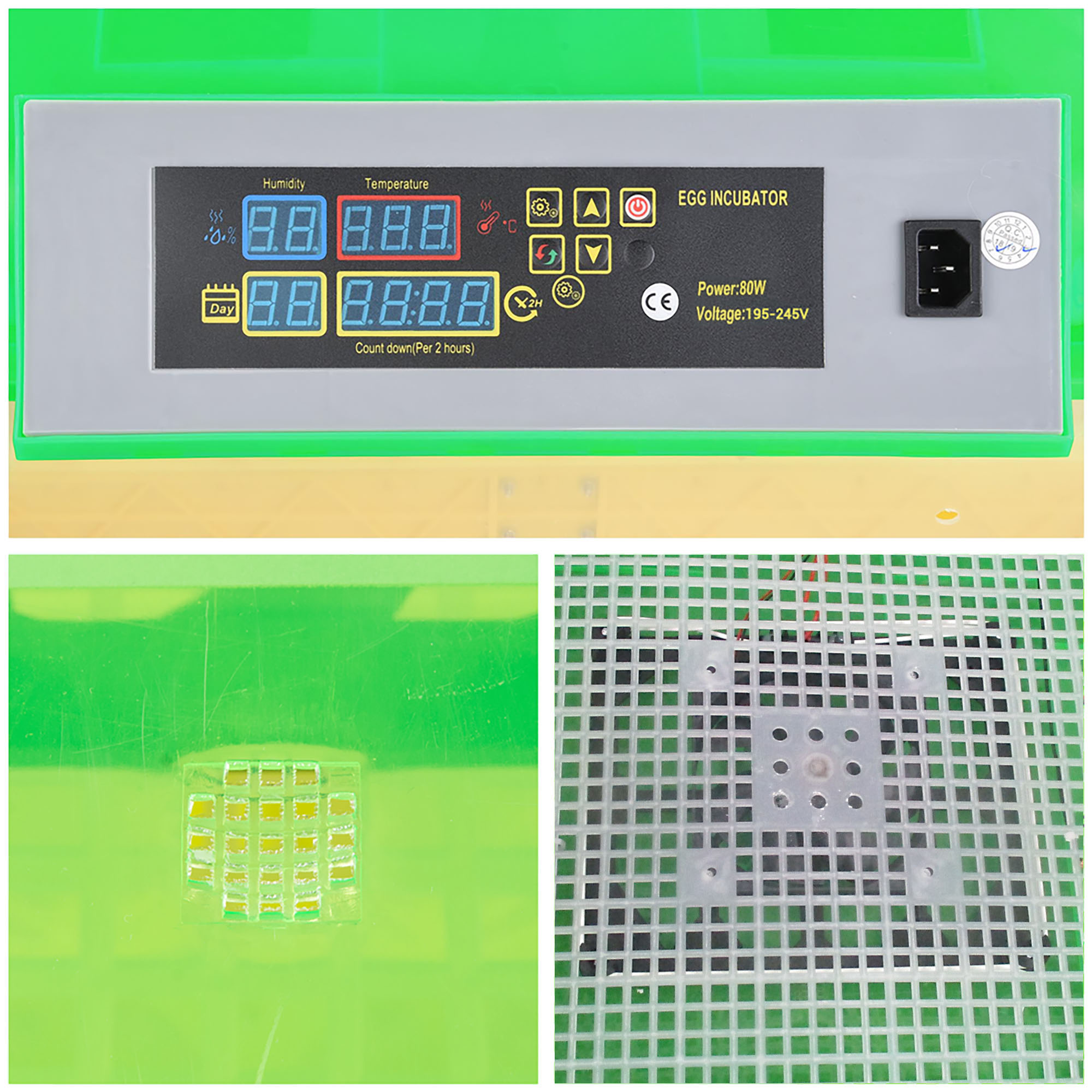 - Digital Display & Intelligent Alarm - LED digital display for showing temperature, humidity, hatching day and egg turning countdown time; intelligent integrated circuit control for providing low/high temperature alarm range setting & humidity alarm parameter setting for better monitoring and controlling