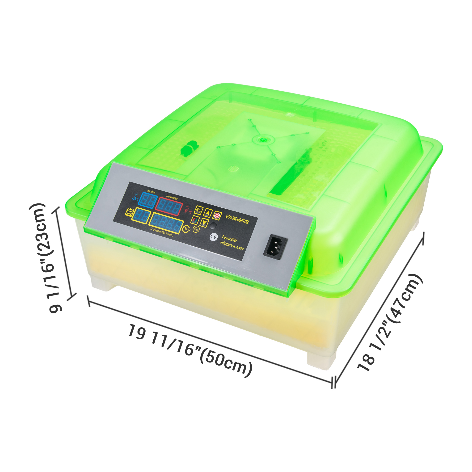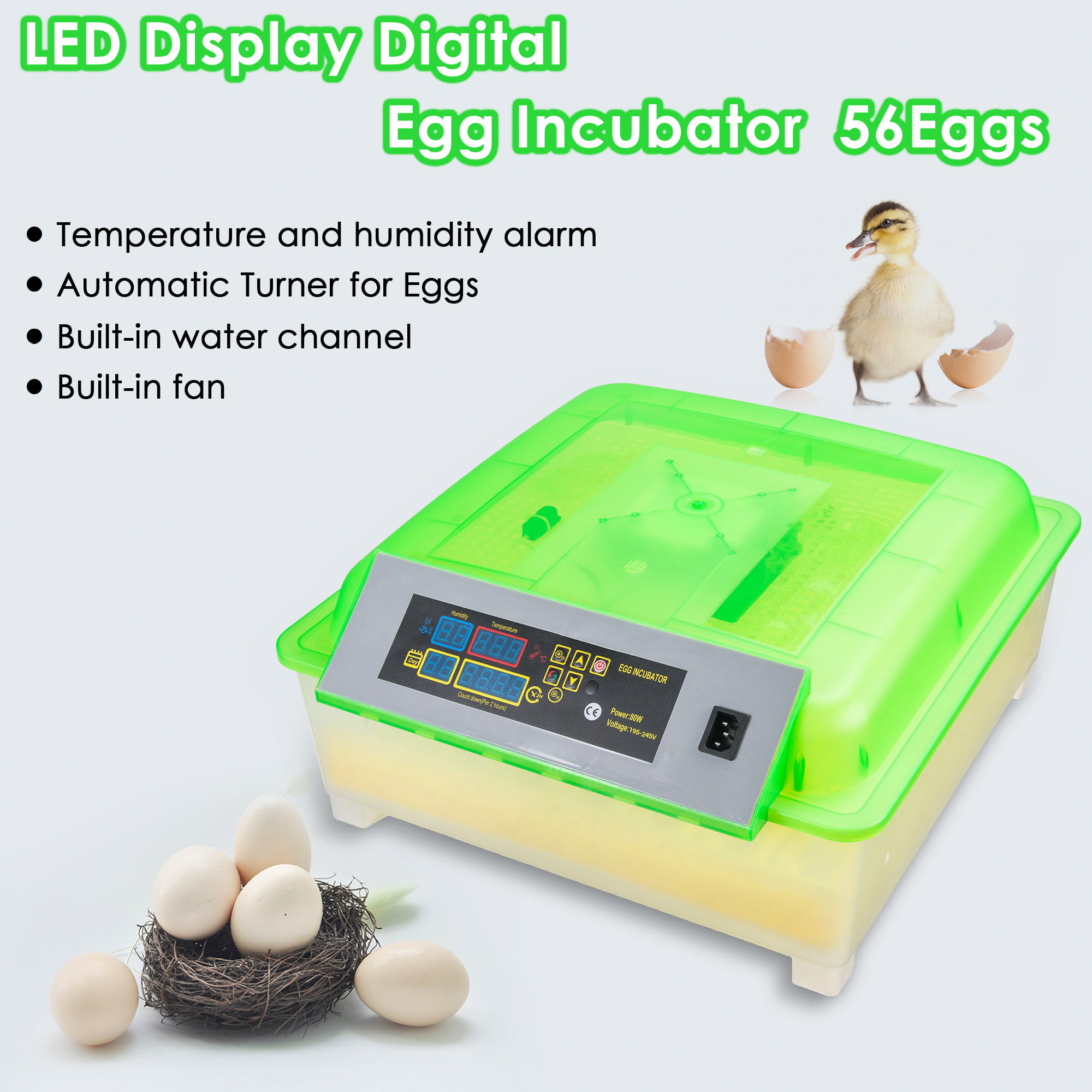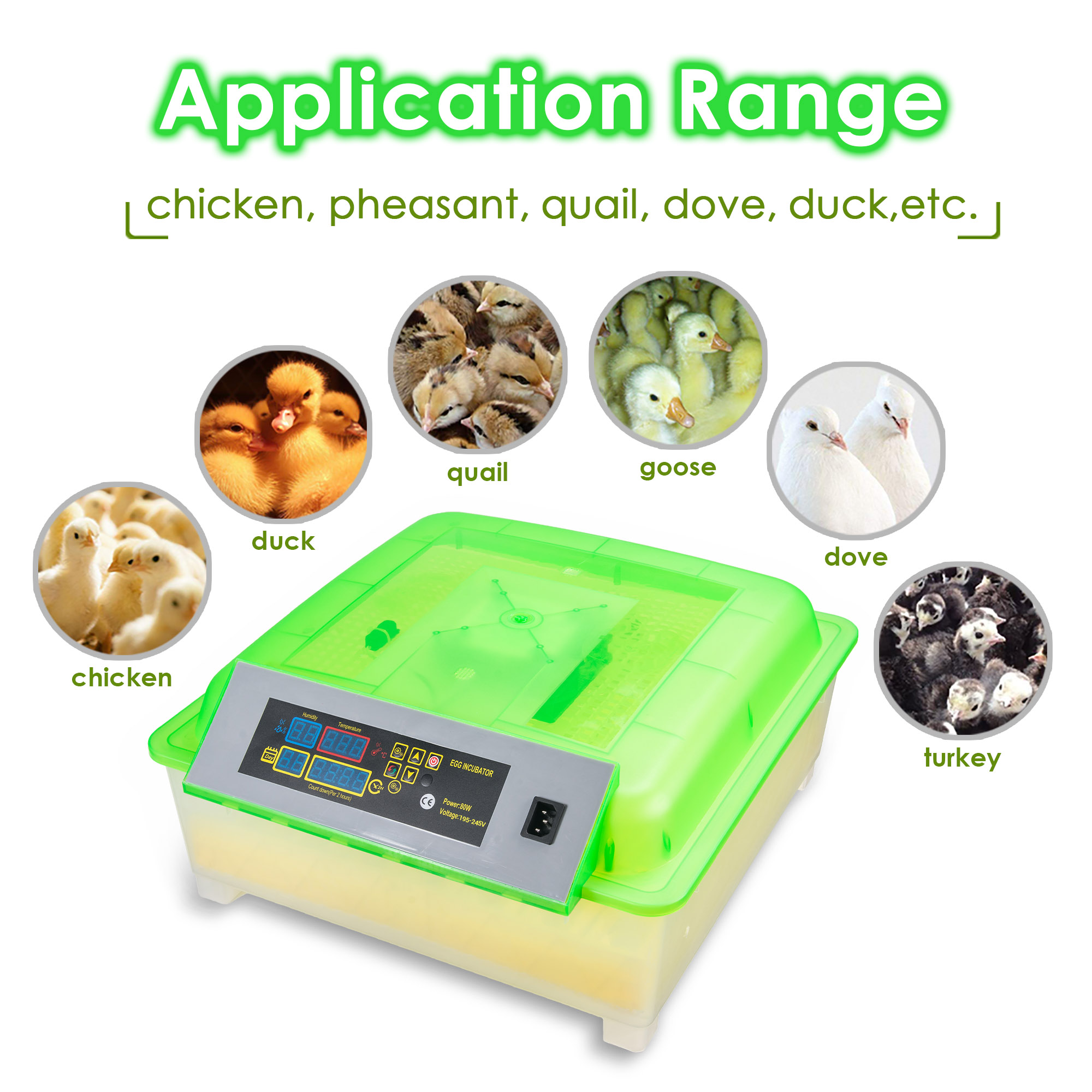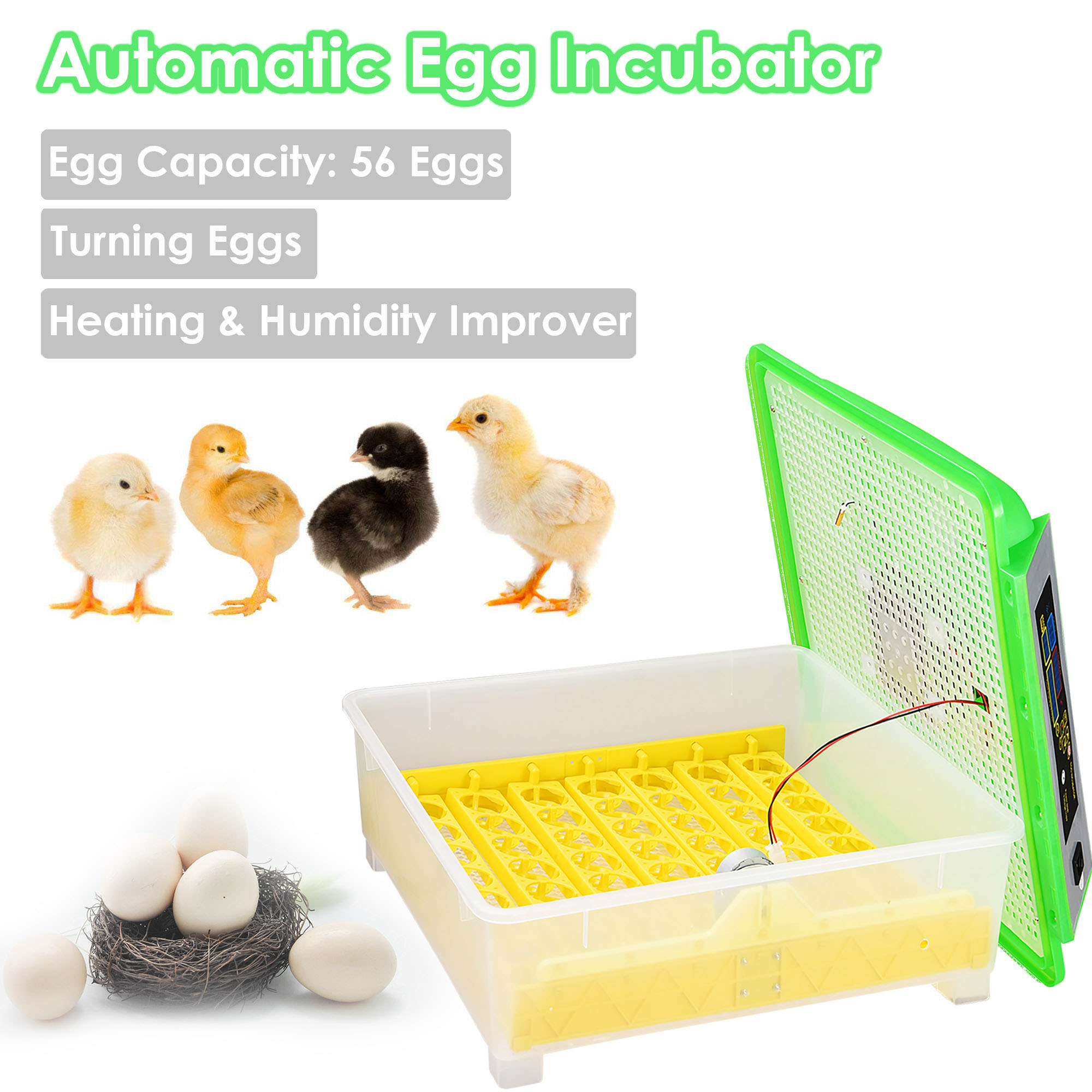 - Large Egg Capacity - 19 11/16”x18 1/2”x9 1/16” automatic egg incubator with large capacity for holding up to 56 normal sizes eggs and it can hatch chicken, ducks, pigeons, quails, birds, geese, etc; perfect for incubating large number of eggs at a time and watching the whole hatching process of different eggs