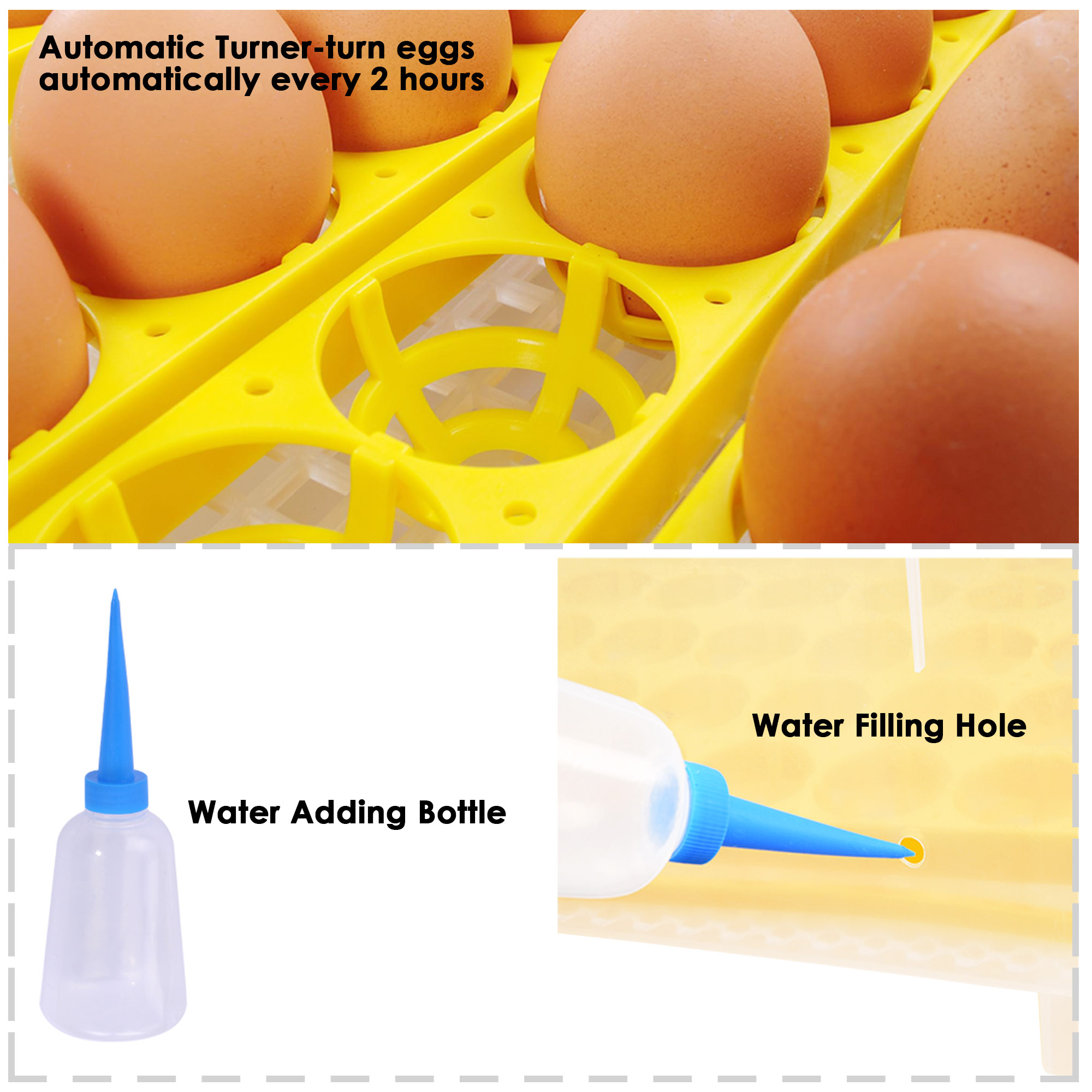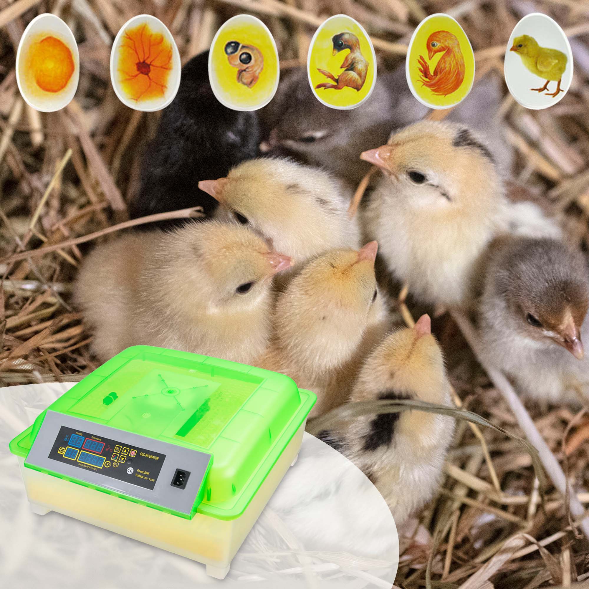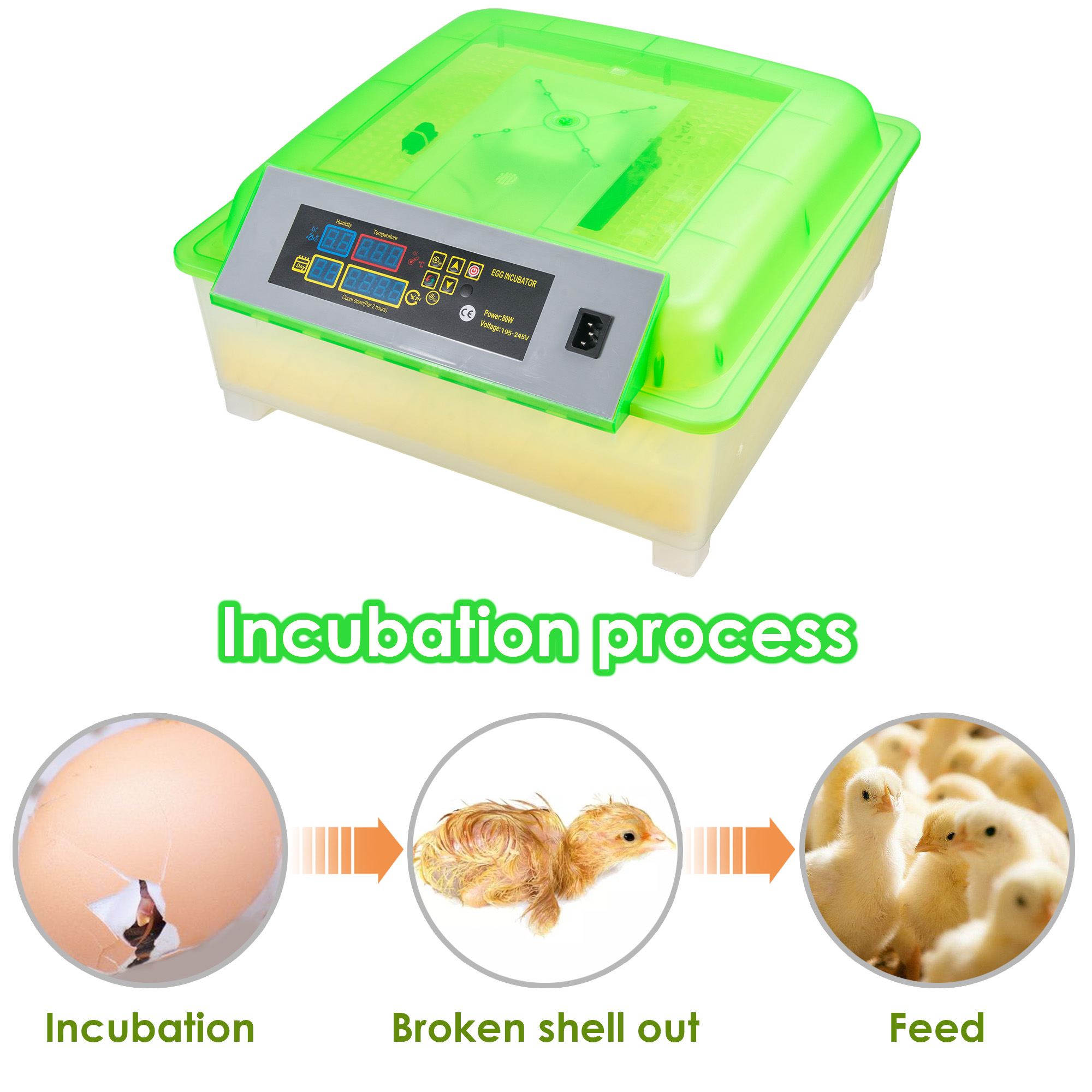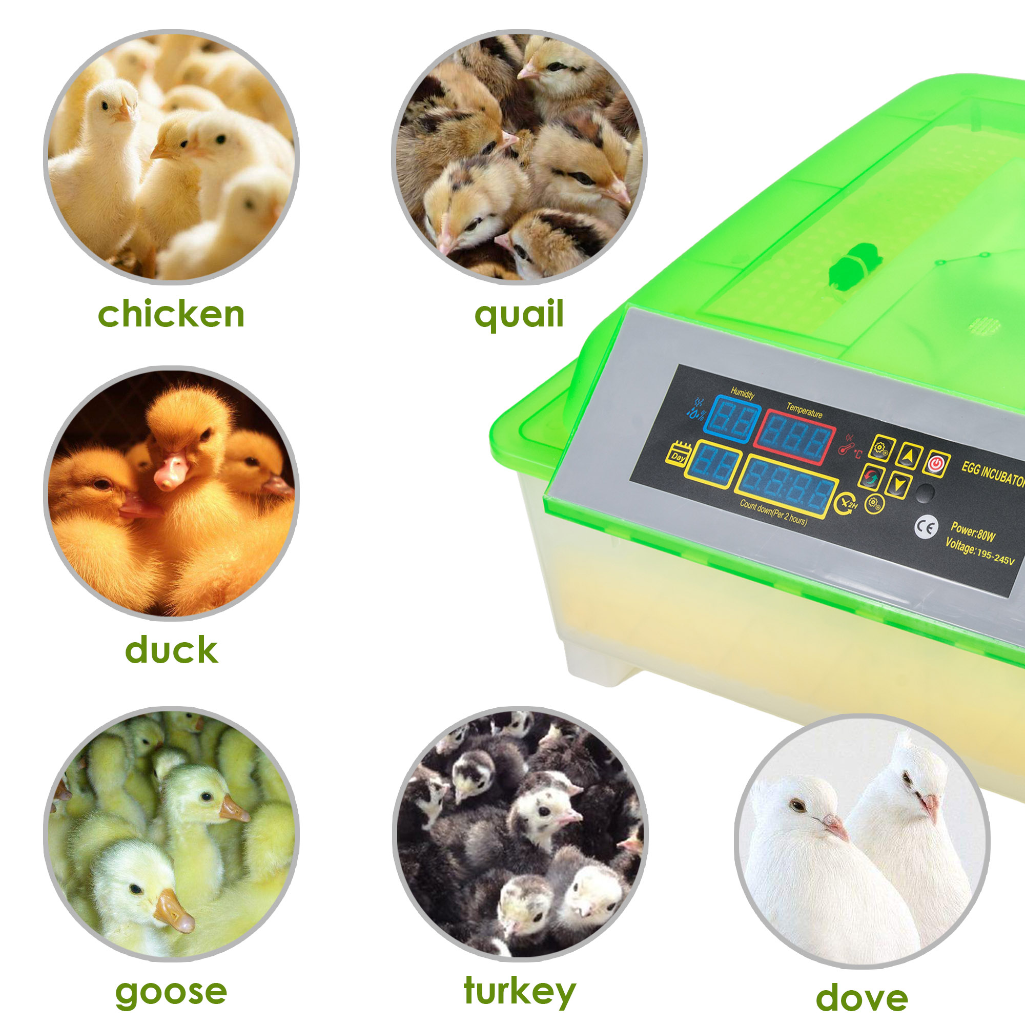 - Large Egg Capacity - 19 11/16”x18 1/2”x9 1/16” automatic egg incubator with large capacity for holding up to 56 normal sizes eggs and it can hatch chicken, ducks, pigeons, quails, birds, geese, etc; perfect for incubating large number of eggs at a time and watching the whole hatching process of different eggs