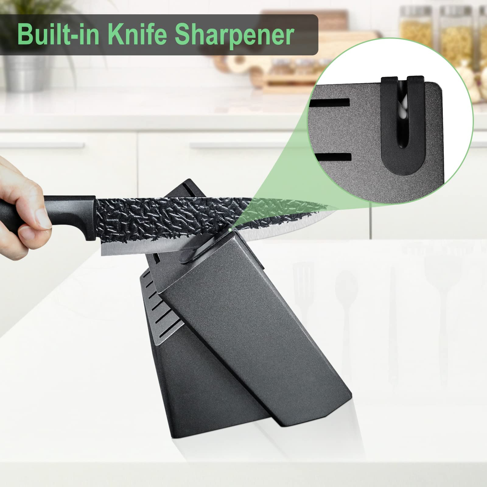 This block included sharpener, which can make the knives durability and keeps them in excellent or sharp at any time. It doesn't take up much space, just rub the knife back and forth on it for a rub or two.
