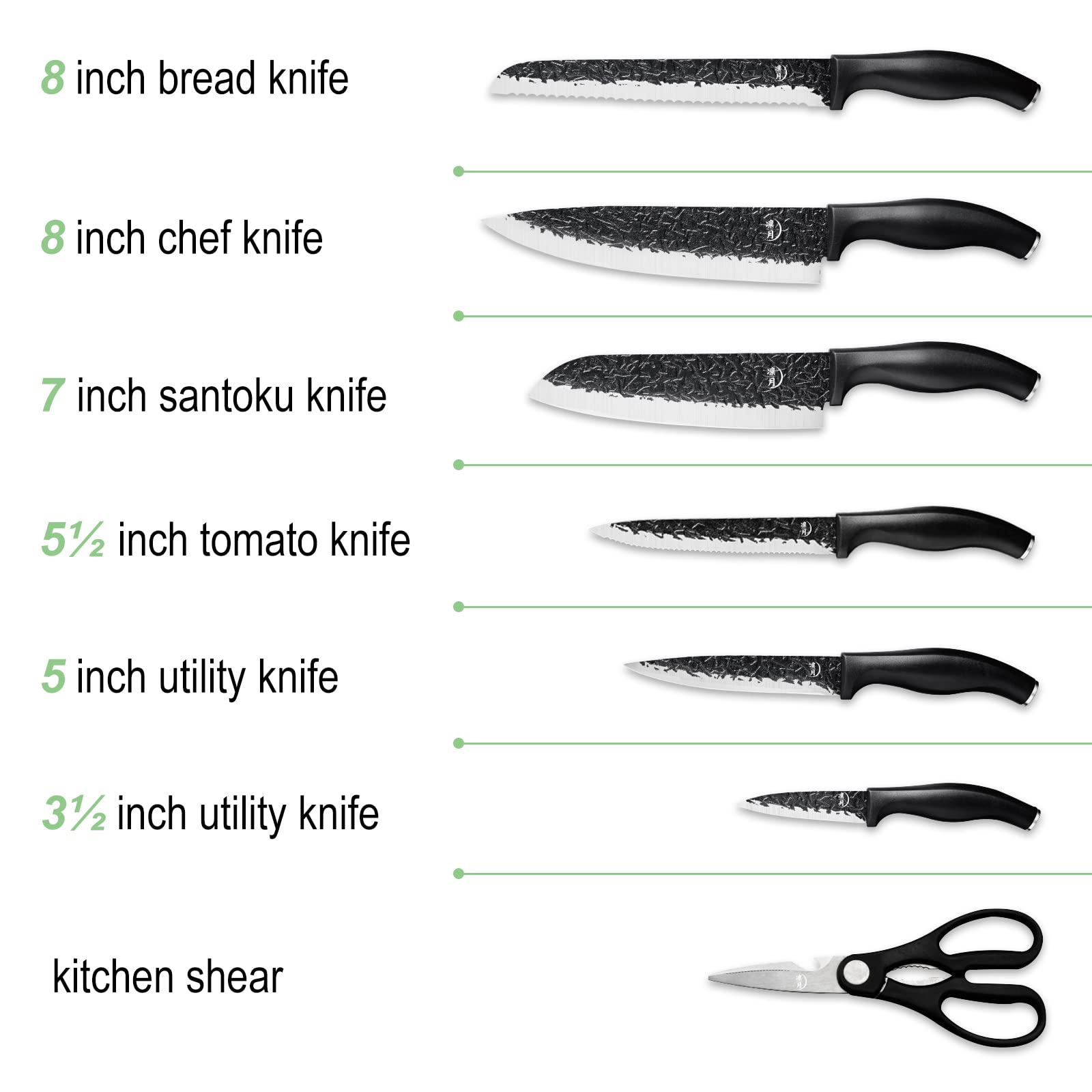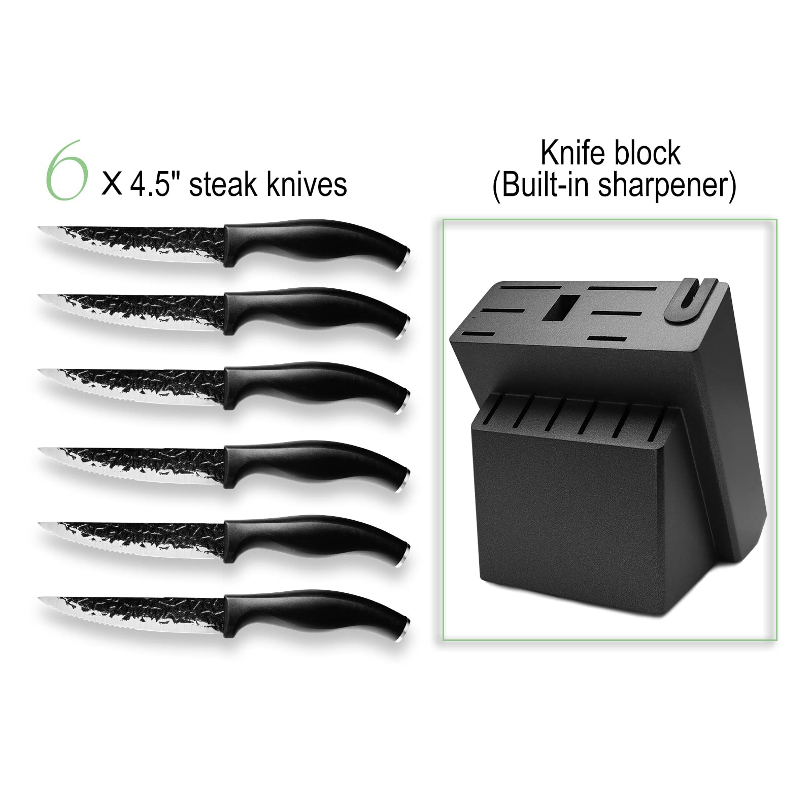 【14-Pcs Kitchen Knife Set】 Packing includes: 8 inch chef knife, 8 inch bread knife, 7 inch santoku knife, 5.5 inch tomato knife, 5 inch utility knife, 3.5 inch paring knife, 6pcs 4.5 inch steak knife, kitchen scissors, acacia wood knife block with build in sharpener.