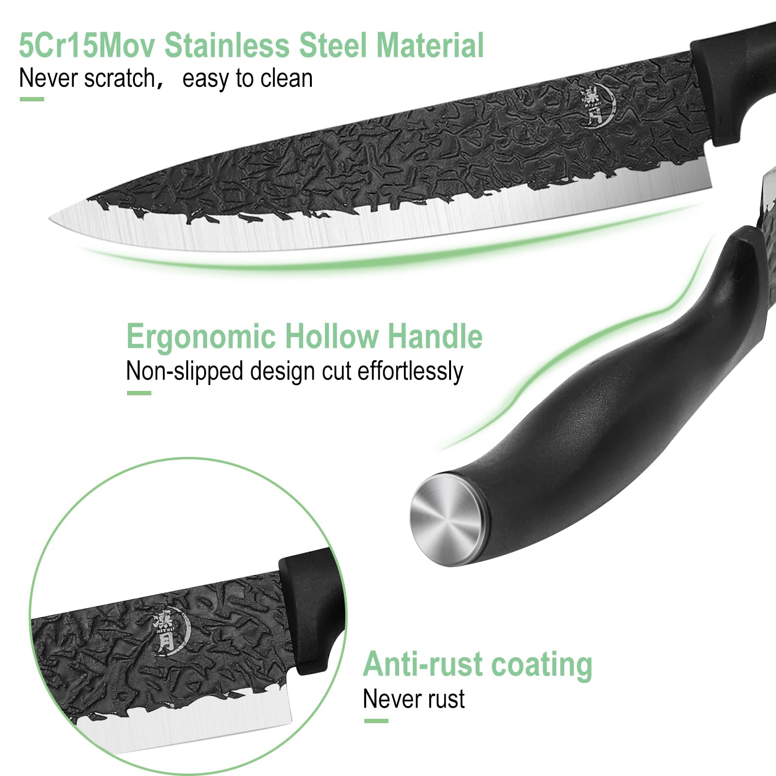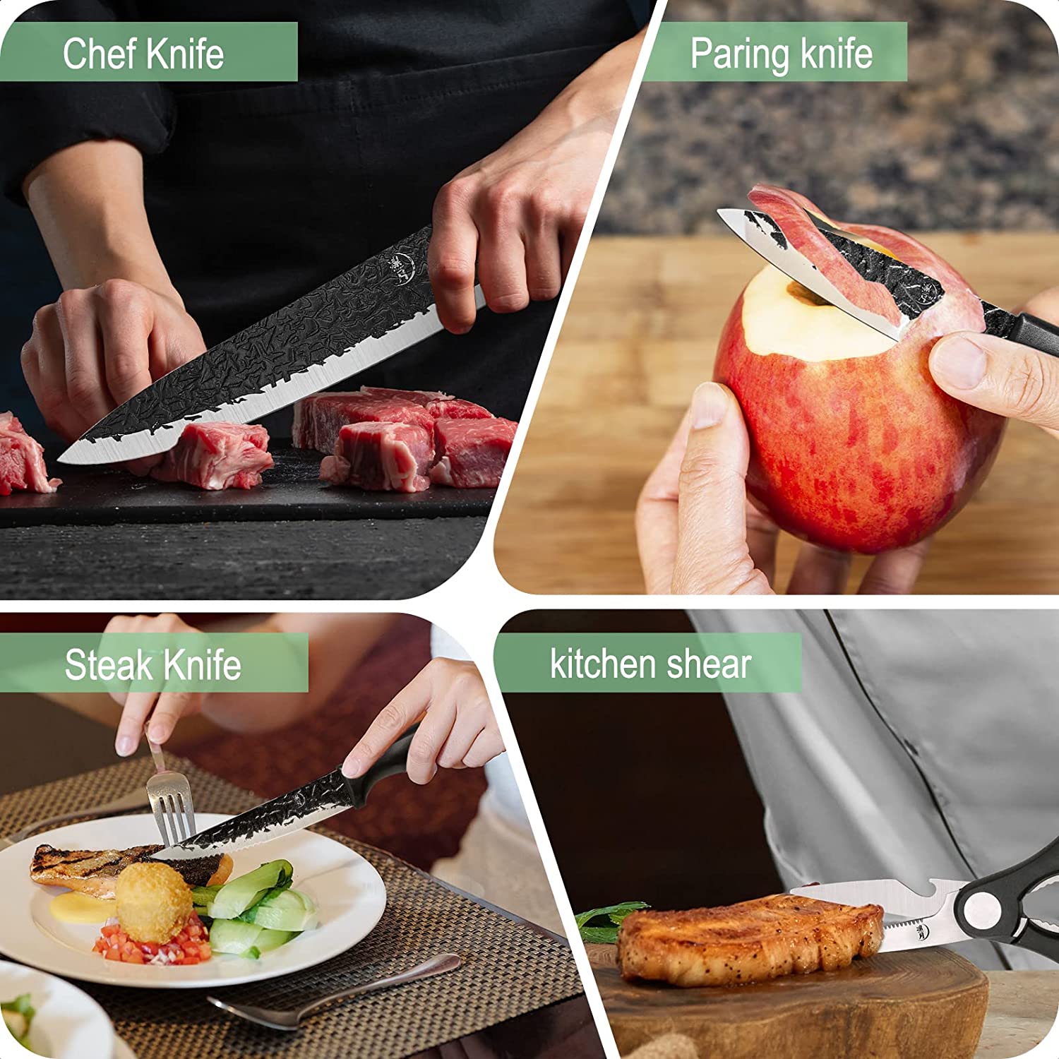 【Effortless & Safe Knife Set】The blade has hammered forged, nonstick black coating helps prevent food from sticking to the blade for faster, easier cutting. This ultra sharp knife can be used for your daily kitchen tasks of chopping, slicing, dicing, and mincing all kinds of meat, vegetables, fruits, bread and paring.