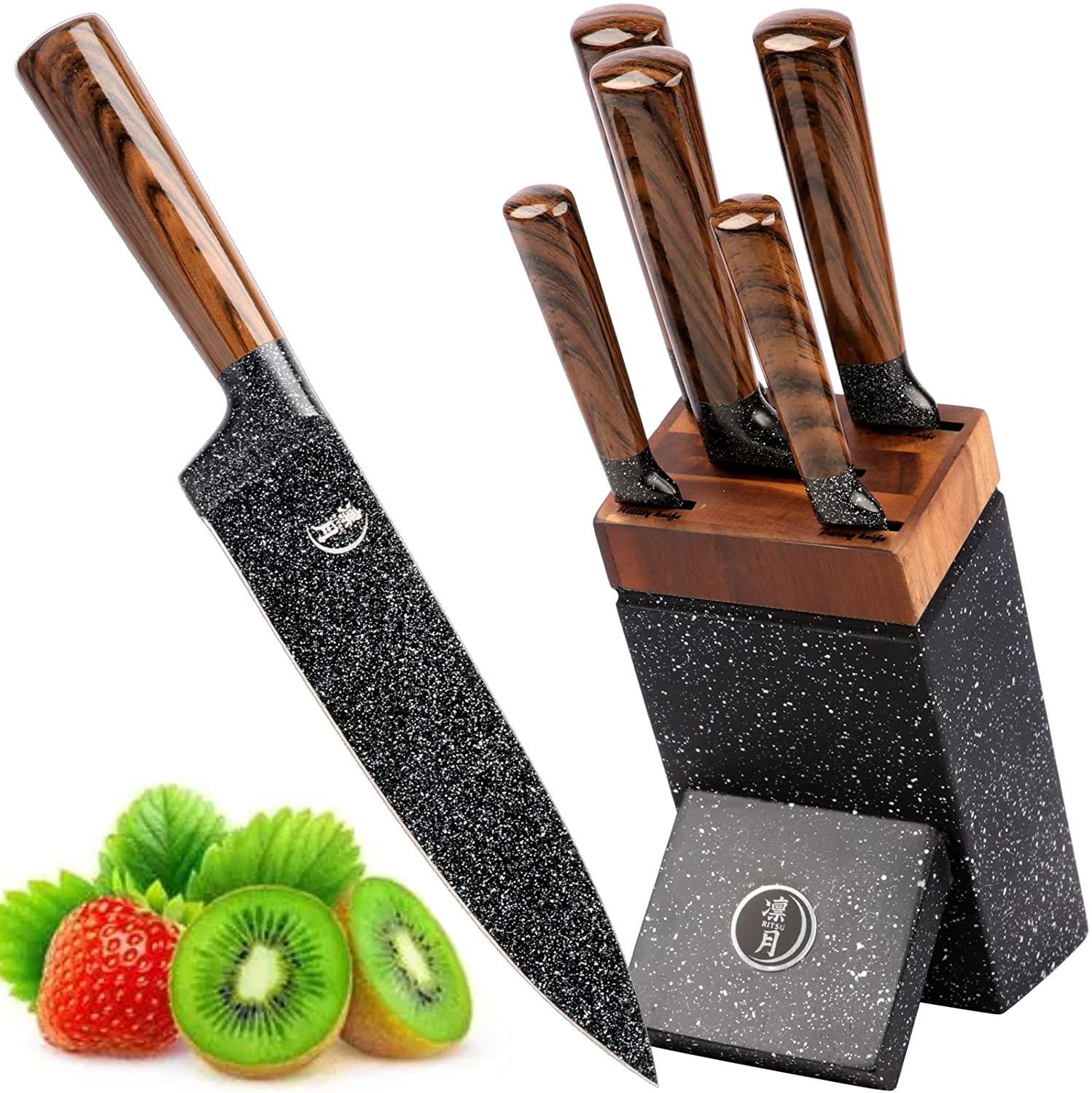 The RITSU 6 pieces knife set with block are made of high-quality German steel, blade coated with black Titanium that rust proof and durable. Perfect for both professional and beginner. No rust, stains and broken here!