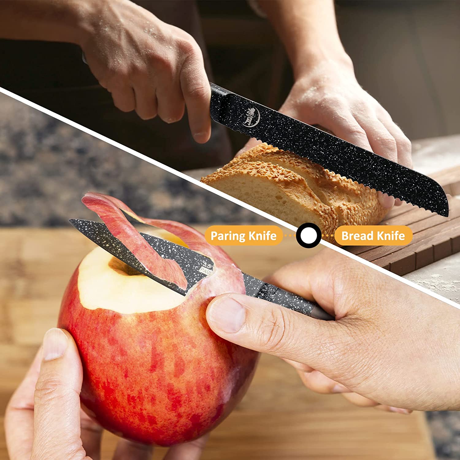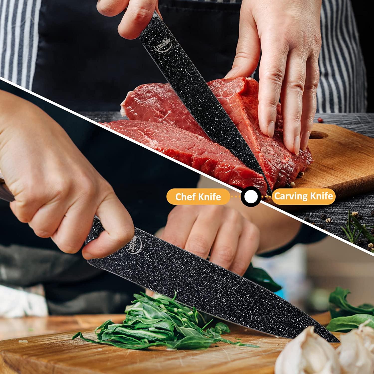 【Non-Stick Coating Blade】The kitchen knife set blades adopt the technology of black titanium plating for the blade, greatly improving the performance of anti-rust and anti-corrosion. What's more, this surface makes the blades with non-stick properties, release the food and you're no longer to push the food which stick on the blade when every once slicing, highly improve the efficiency of the kitchen working.