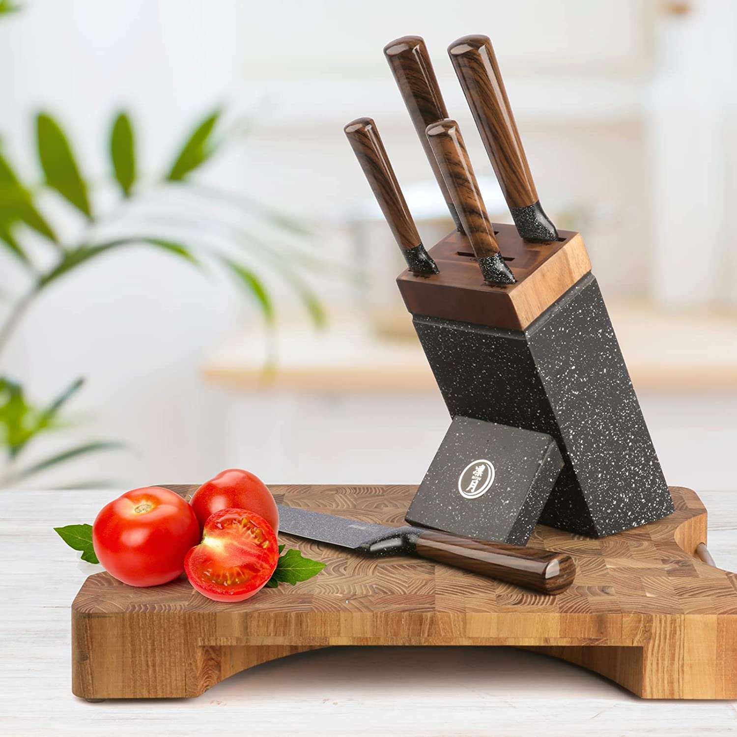 【Premium German Steel】Superior German steel made the blades with high-quality and good toughness, the edge with long-lasting sharpness keeping. This knife set with block can be used for your daily kitchen tasks of chopping, slicing, dicing, and mincing of all kinds of meat, vegetables and fruits, bringing you an efficient cutting experience.