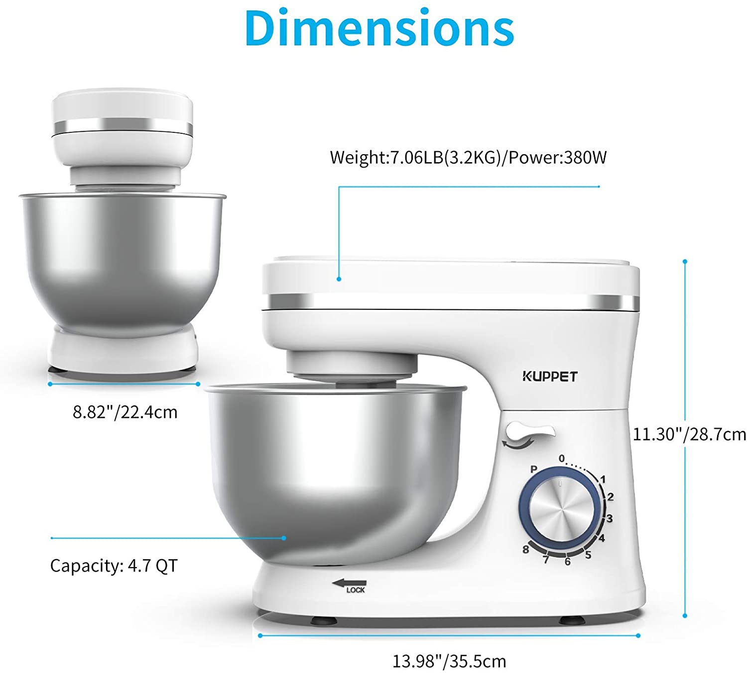 Three attachments are easily secured to the shaft, adding mixing versatility to any job, allowing you to cook at great ease and convenience. KUPPET stand mixer is an allsome kitchen helper. It can basicly do anything as you needed in thekitchen area such as whipping heavy cream, mixing salad and flour dough, etc...