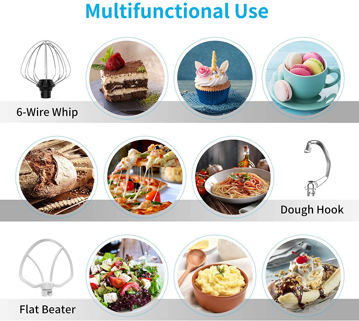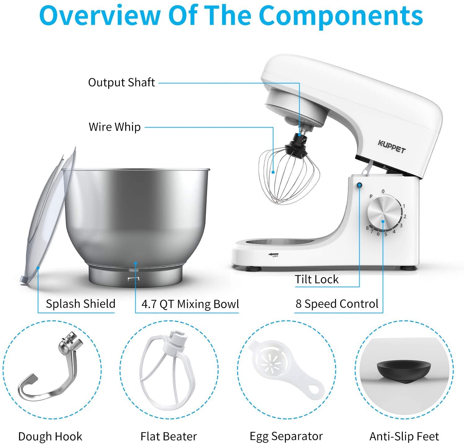 Tilt Head DesignThe tilt head stand mixer not only provides easy access to the bowl and the connected mixer, but also makes it easy to install and remove the stainless steel bowl and 3 accessories. | Anti-slip silicone suction cupsAnti-slip silicone suction cups makes the stand mixer keep steady while the stand mixer is working. | 8 SpeedsPowerful enough for nearly any task or recipe, whether you’re stirring wet and dry ingredients together, kneading bread dough or whipping cream. |