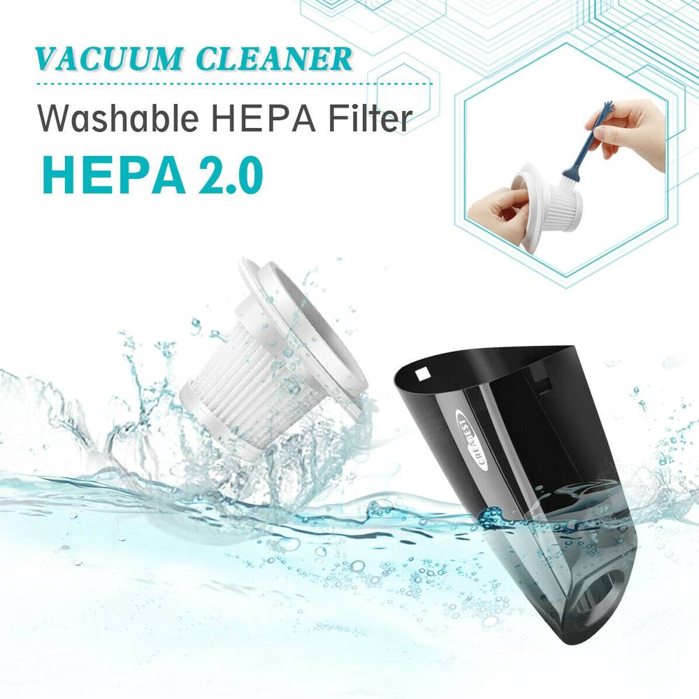 HEPA Filter: HEPA filter: hand held vacuum cleaner with detachable, washable and reusable HEPA filter. More powerful and durable than ordinary filters. Please dry the pile before reuse.