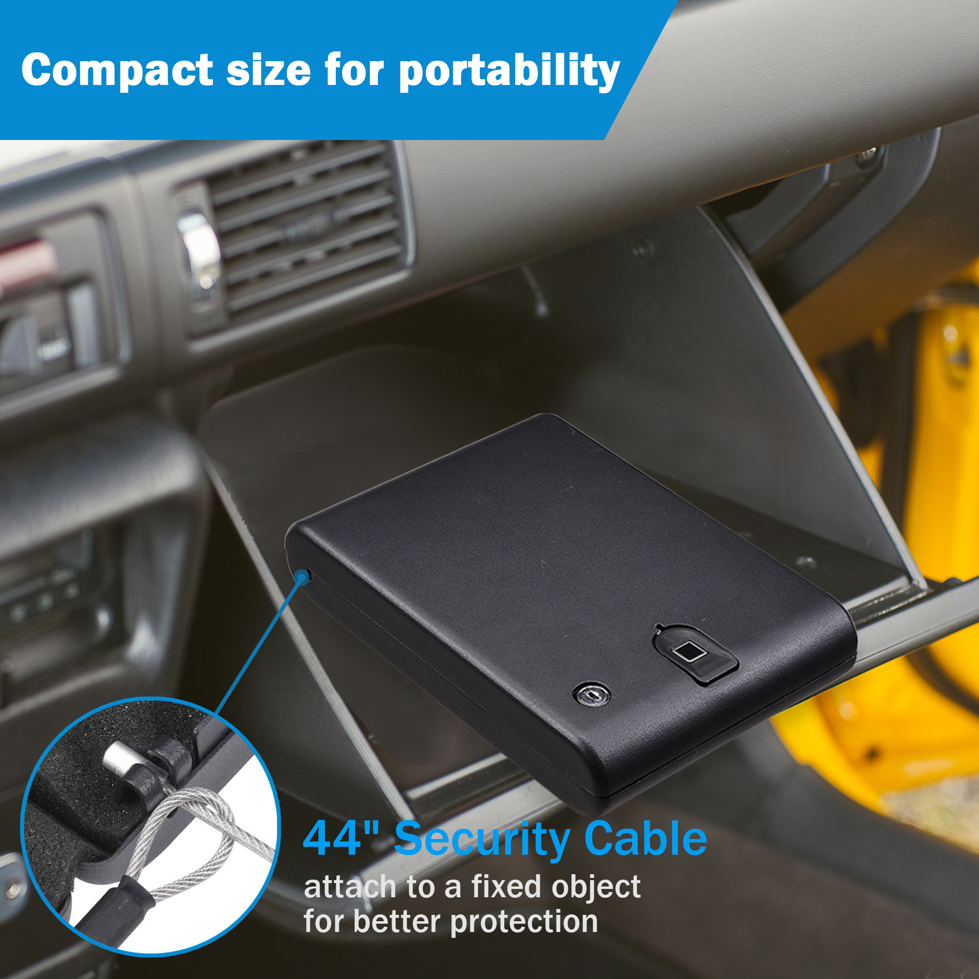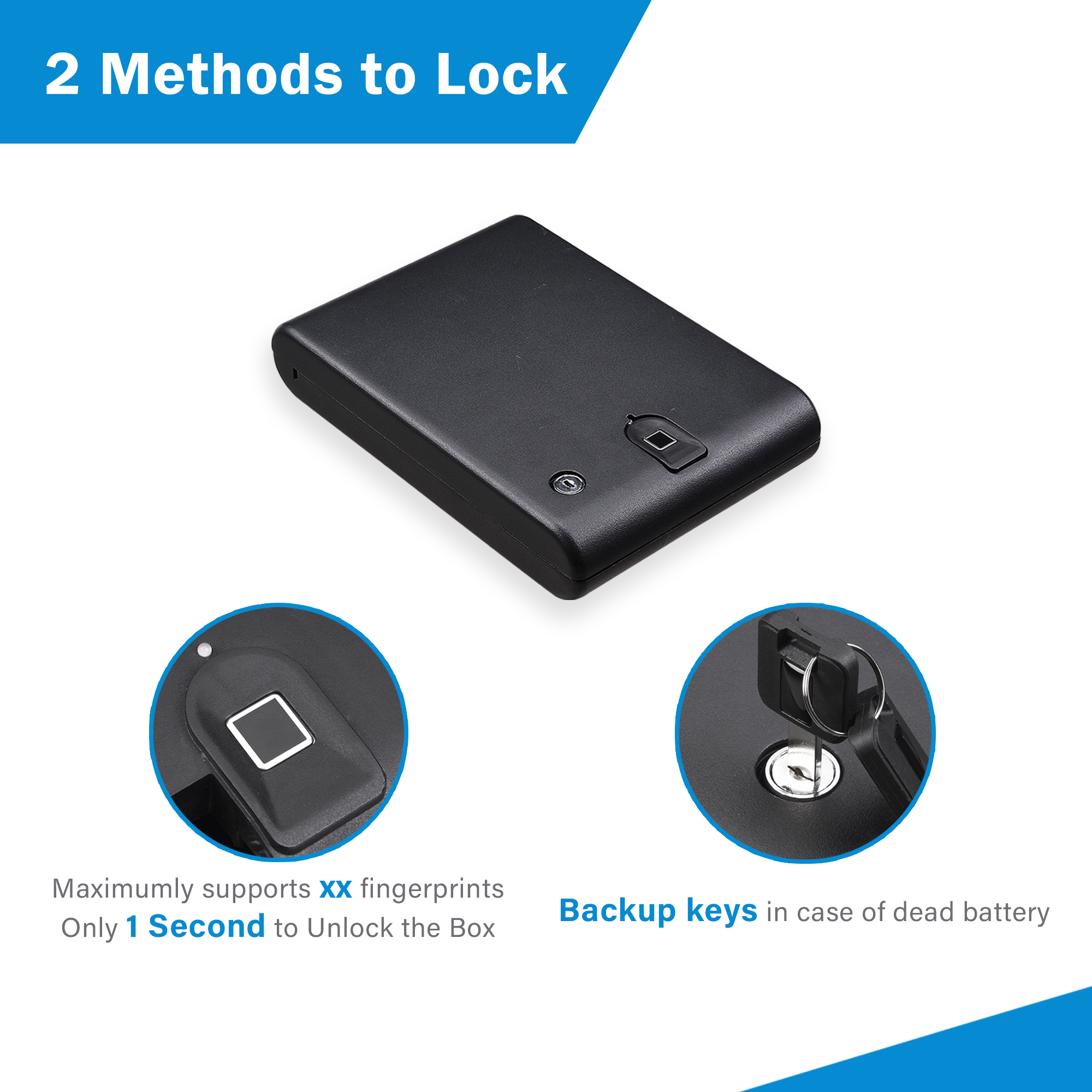 Fingerprint & Keys for Dual Security - Smart Security Box, fingerprint & key 2 opening methods enhance the security; Up to 32 fingerprints can be stored; Fingerprint scanner with quick matching speed for only 3 seconds needed to unlock; You can still use keys to open the box if battery died