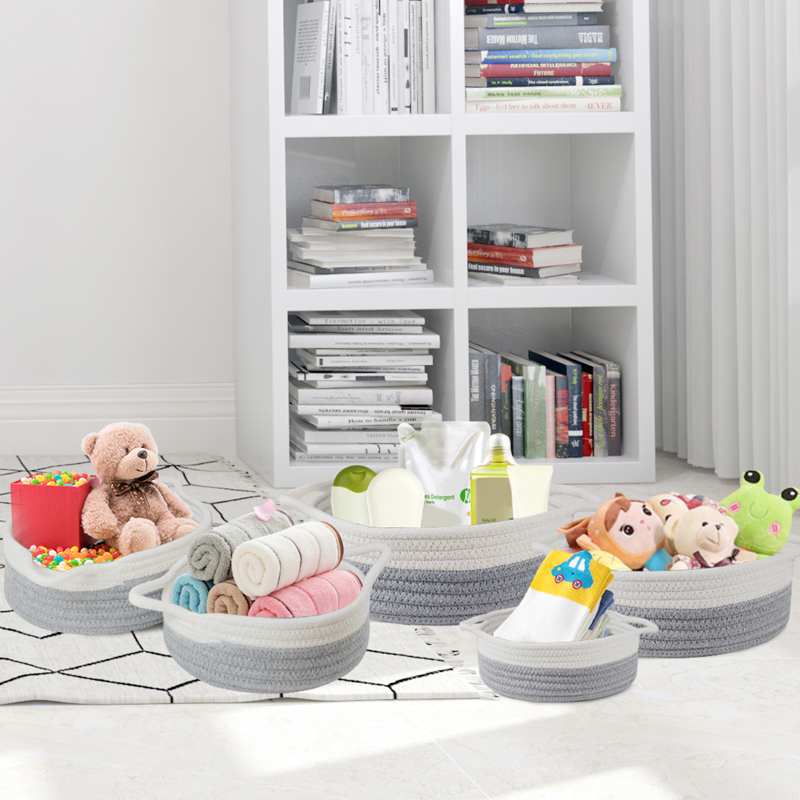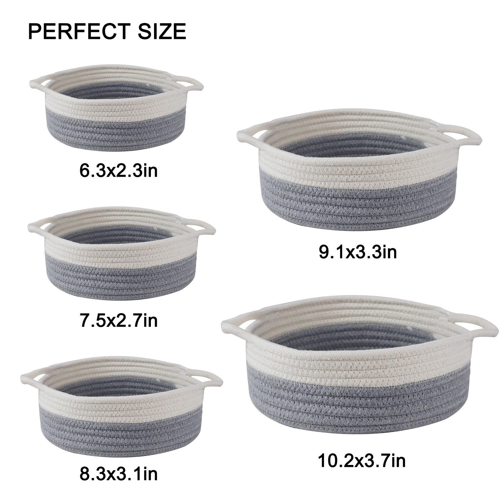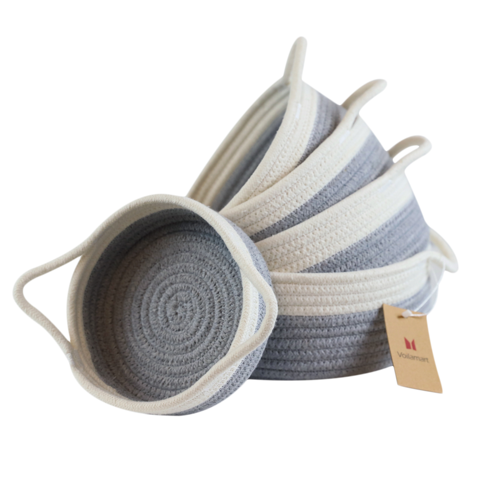 Voilamart Cotton Rope Basket Set of 5,Rope Basket with Handles,Woven Storage Basket,White and Gray Decorative Toy Baskets Setfor Baby Nursery toys, Remote, Controls, Phone, Stationary, Makeup