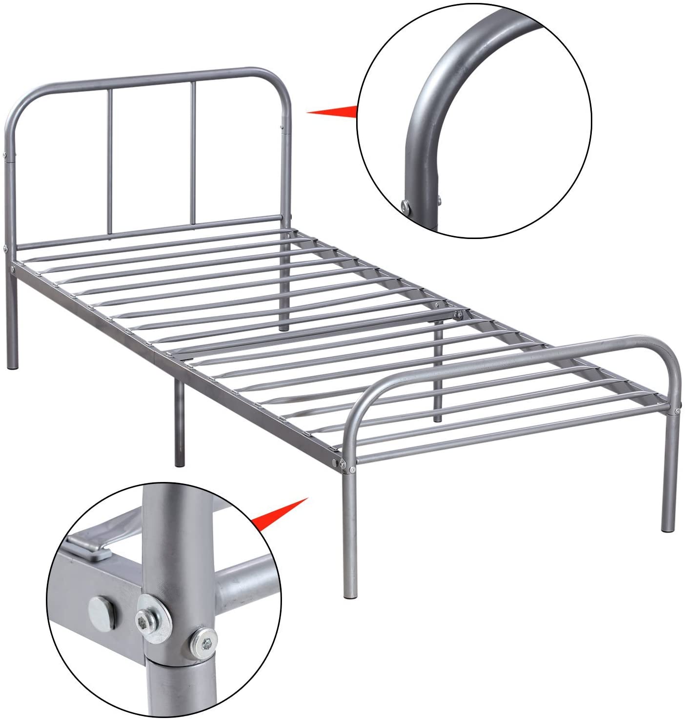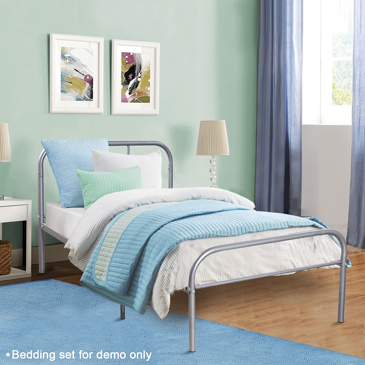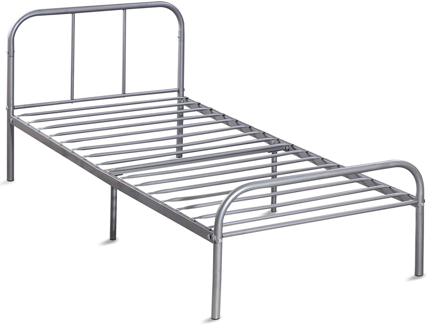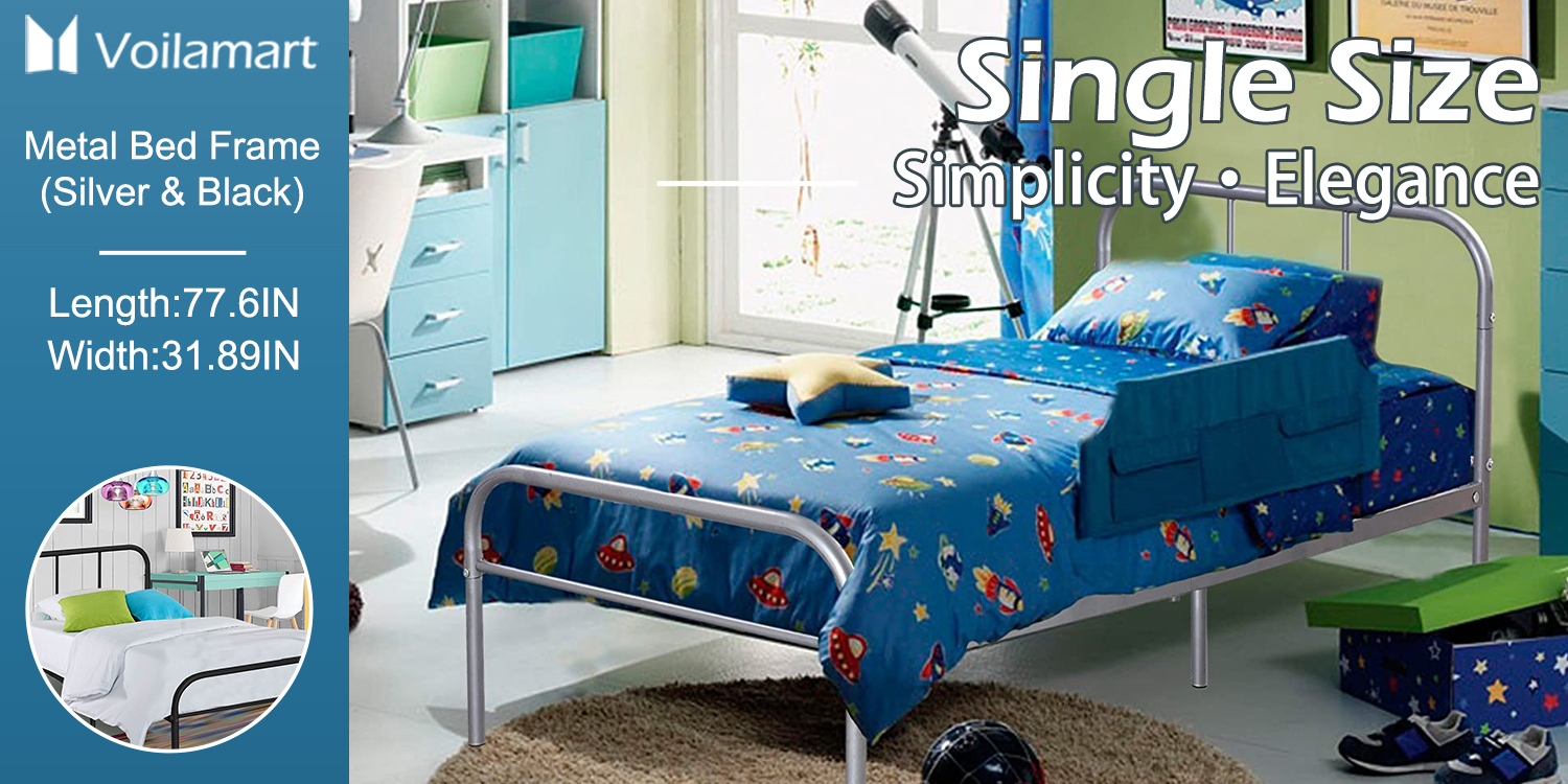 This Twin Size Silver Metal Bed Frame has a timeless look that will compliment any bedroom decor. With sturdy construction, this metal bed frame includes metal slats and supporting legs for added support and comfort. It is a stunning addition to any bedroom.