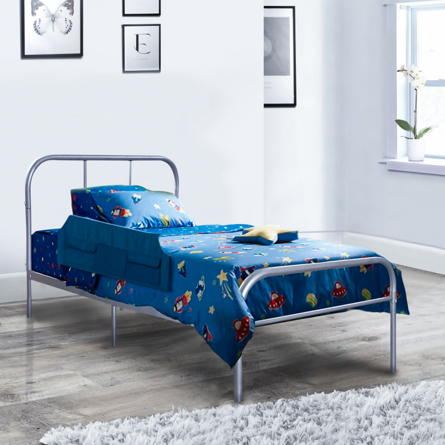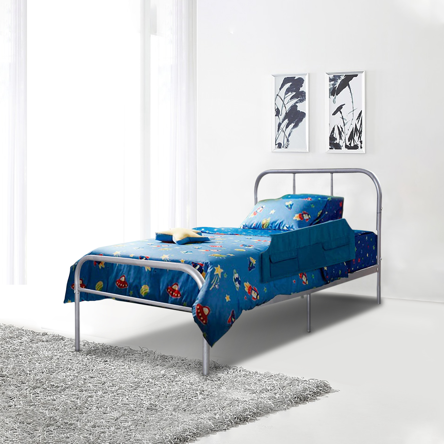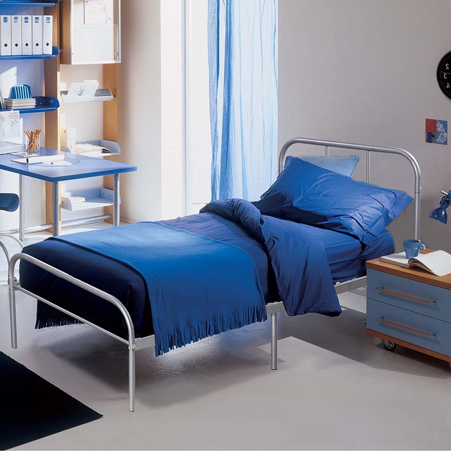 This Twin Size Silver Metal Bed Frame has a timeless look that will compliment any bedroom decor. With sturdy construction, this metal bed frame includes metal slats and supporting legs for added support and comfort. It is a stunning addition to any bedroom.