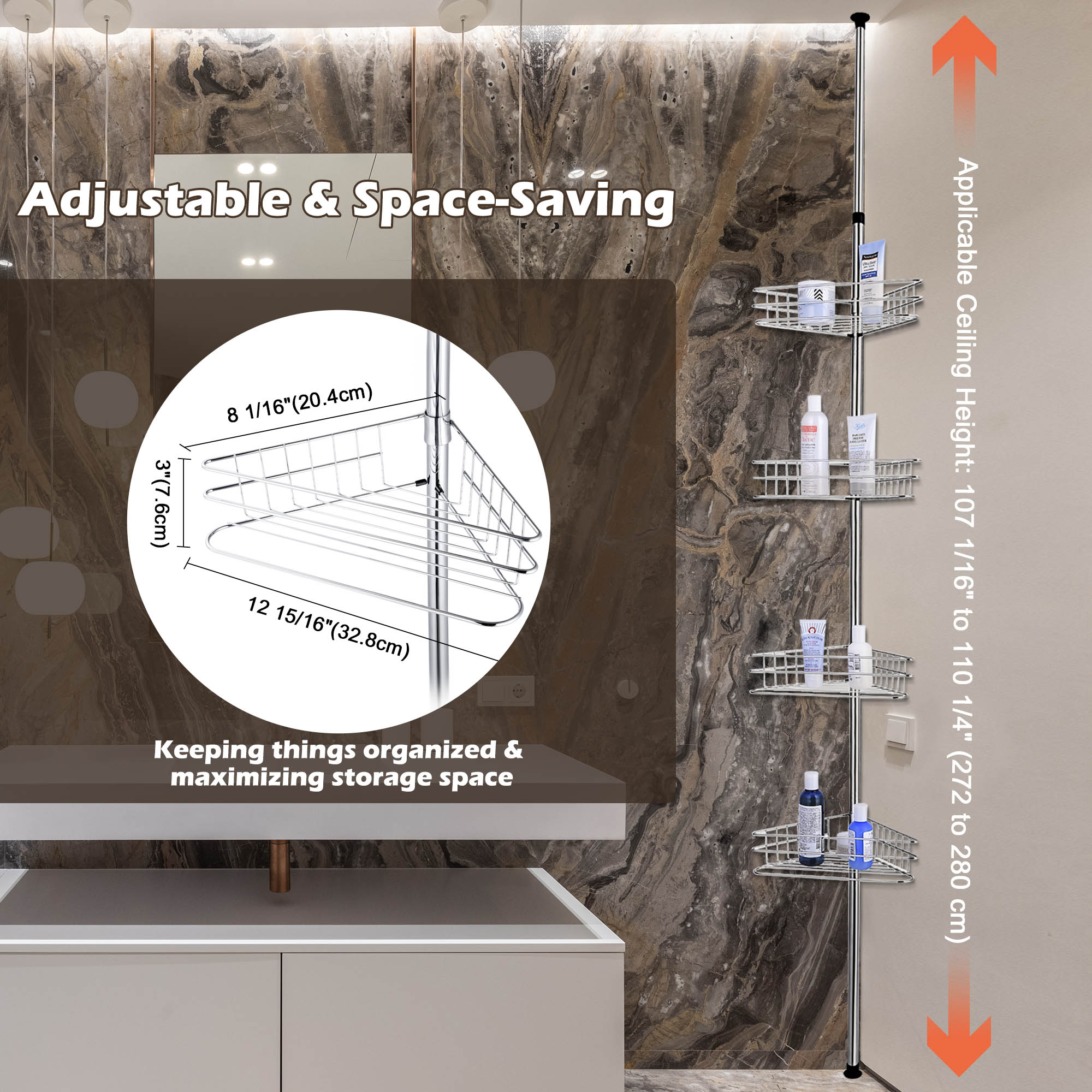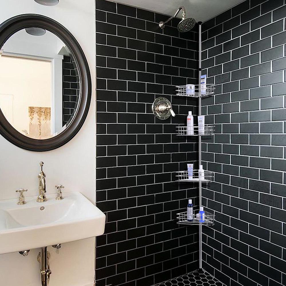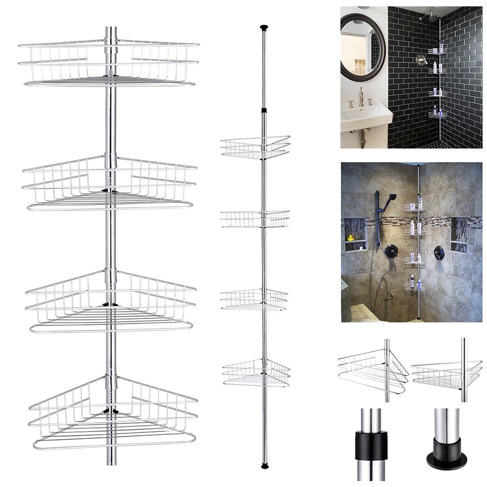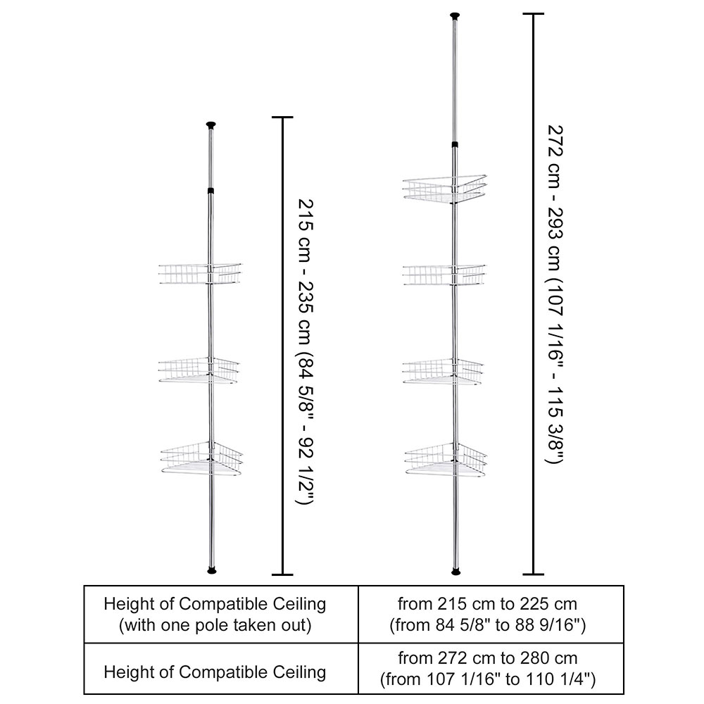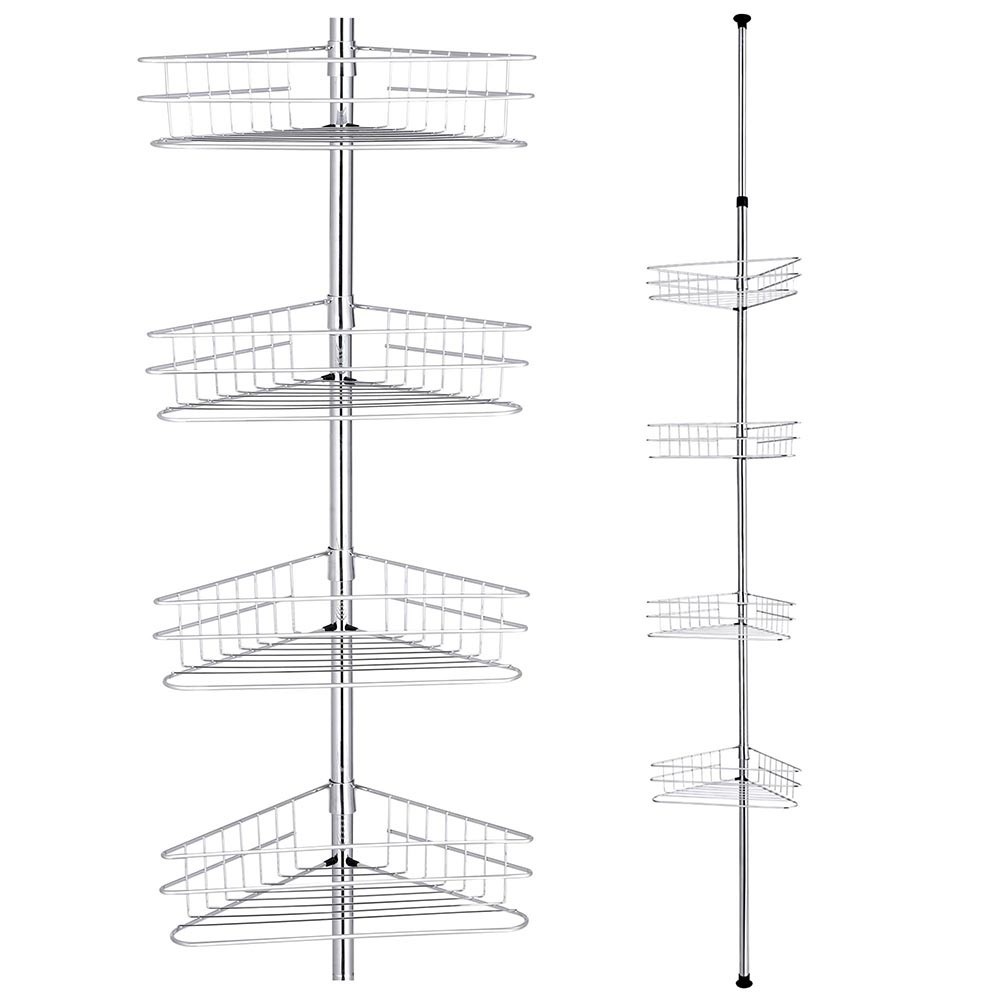 - Adjustable   & Space-Saving - 12 13/16" x 8 1/16" x 107 1/16" 4-tier   wall corner shelf features height adjustment from 107 1/16" to 114   15/16" to fit for ceiling height of 107 1/16" to 110 1/4"; 4   baskets with compact size of 12 13/16" x 8" for holding bath   accessories, perfect for keeping things organized and tidy and maximizing   bathroom storage space