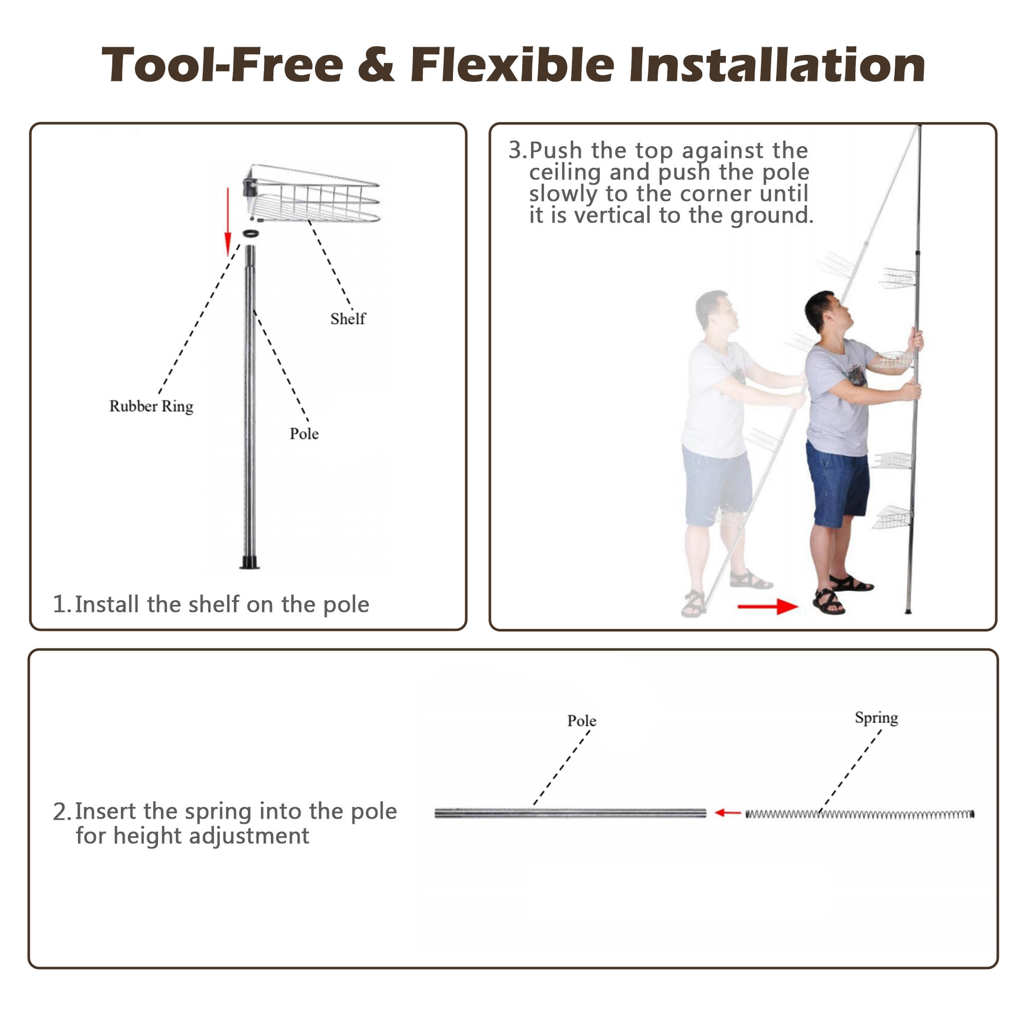 - Tool-free & Flexible   Installation - No extra tools or drilling required, just connect the poles   and install the shelves and push the pole to the wall corner until the pole   is vertical to the wall, you can take 1 pole out to fit for ceiling height   from 84 5/8" to 88 9/16"