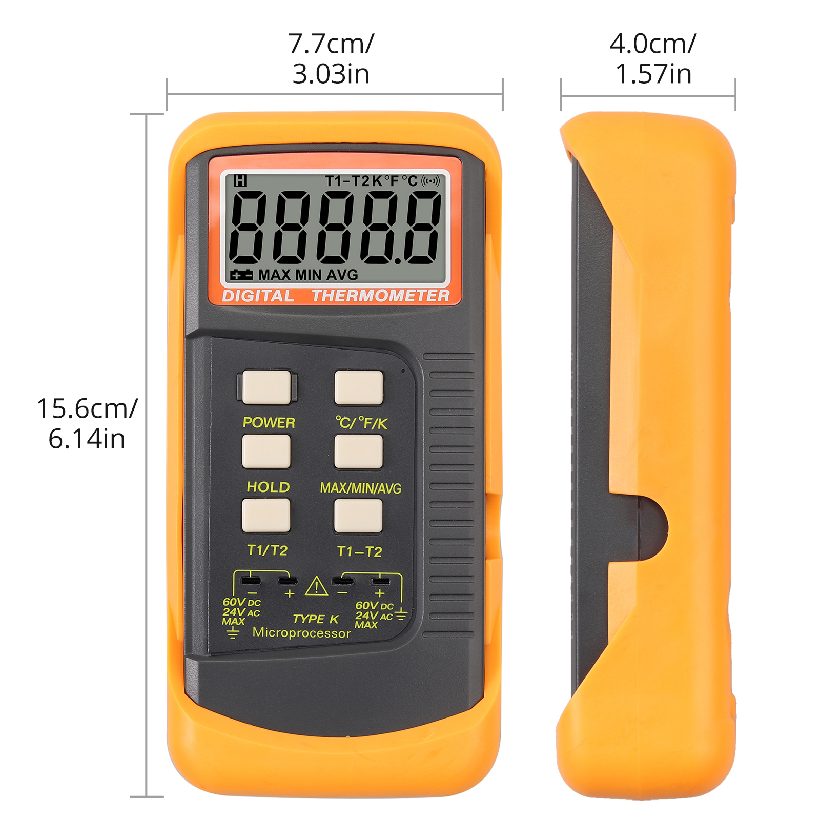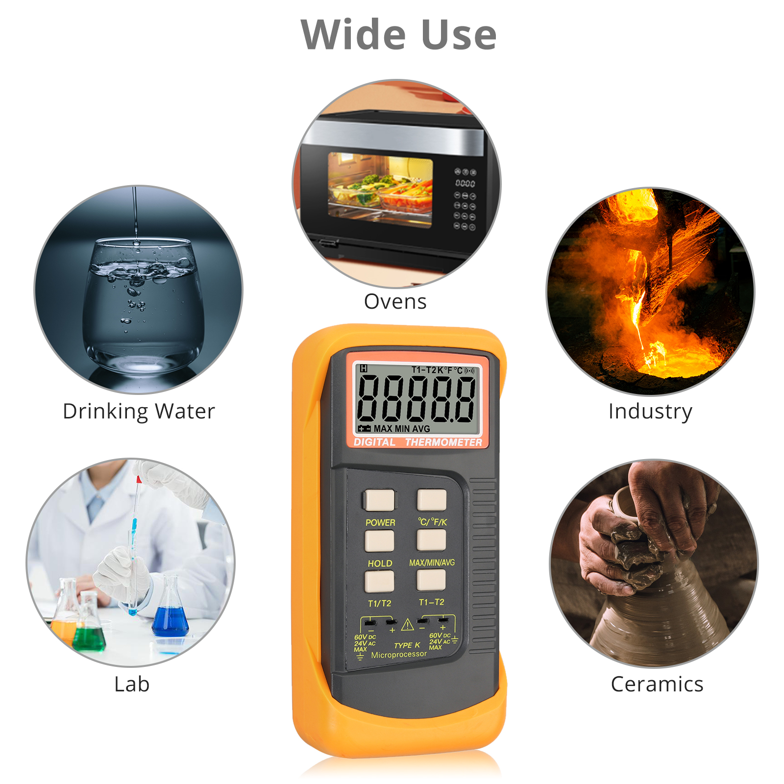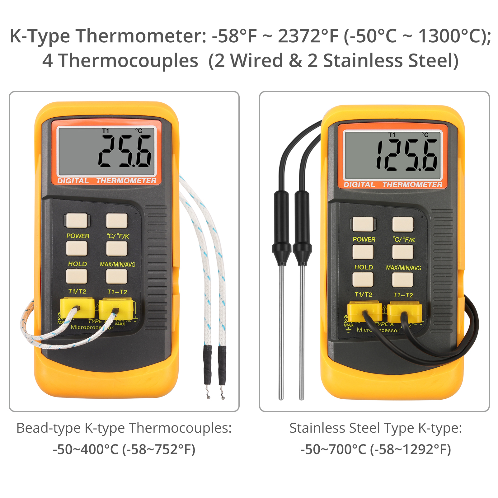 Digitales 2-Kanal-K-Typ-Thermometer mit 4 Thermoelementen (verdrahtet und Edelstahl), -50~1300°C (-58~2372 °F) Handheld-Desktop-Hochtemperatur-Kelvin-Skala Dualer Messsensor
