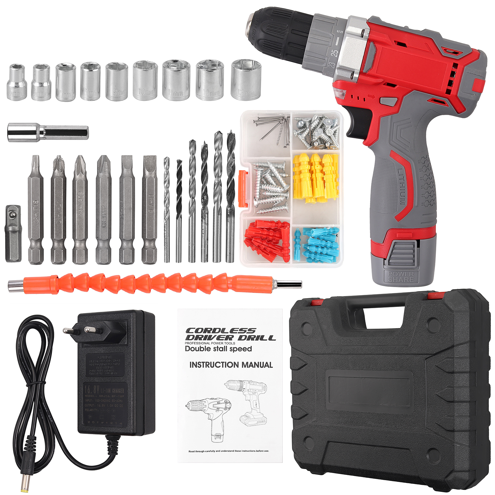 【Verschiedenes BOHRSCHRAUBER-ZUBEHÖR-SET】: Umfassendes Zubehörset, einschließlich der am weitesten verbreiteten Auswahl an Holz-, Metall- und Steinbohrern, 6 Verlängerungs-CRV-Schraubendreher-Bits und 3 Senkbohrern, 9-teilige Stecknüsse in einer robusten Tragetasche, die die Bits ordentlich hält. organisiert und leicht zu finden