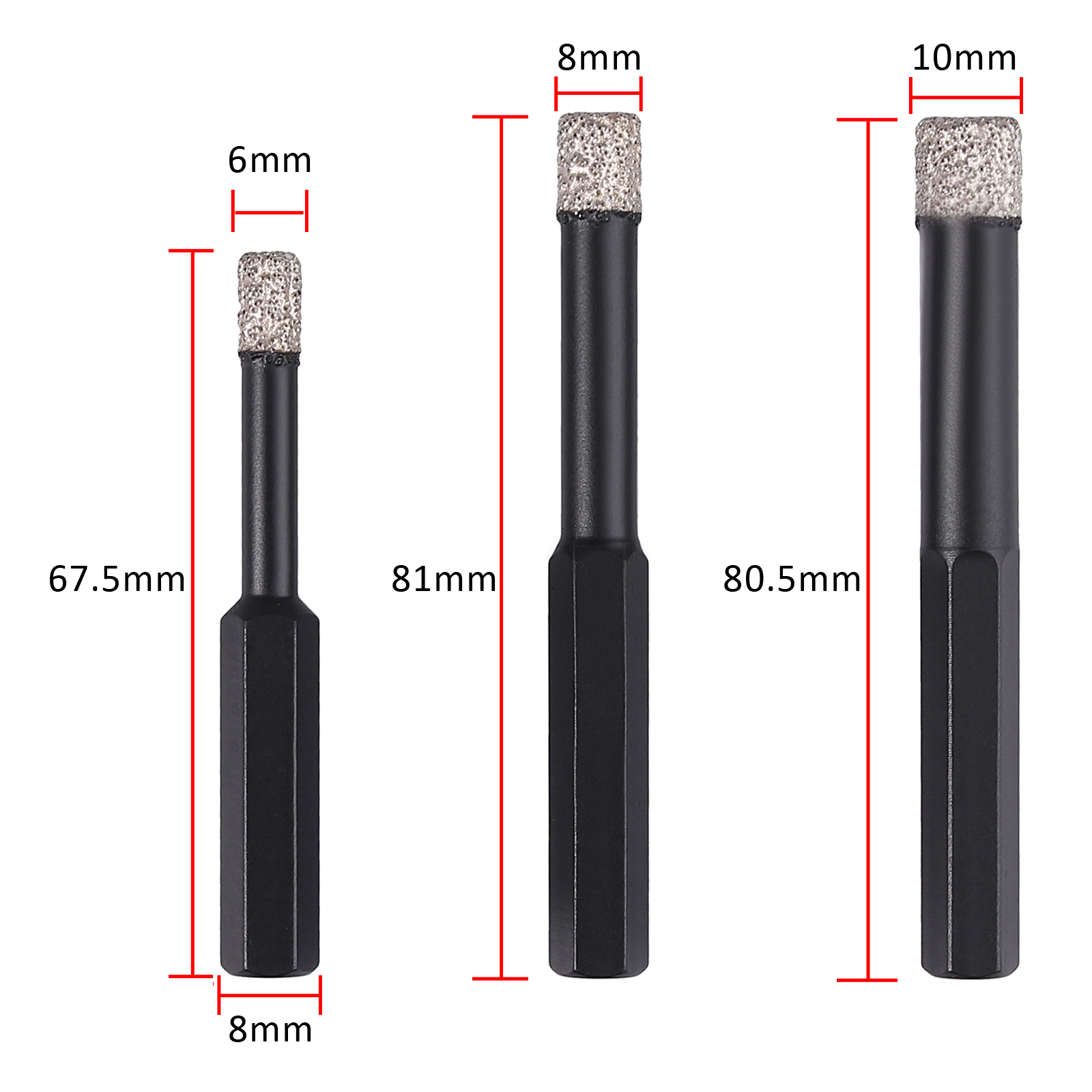3 x Diamant-Trockenbohrer (6 mm, 8 mm, 10 mm)