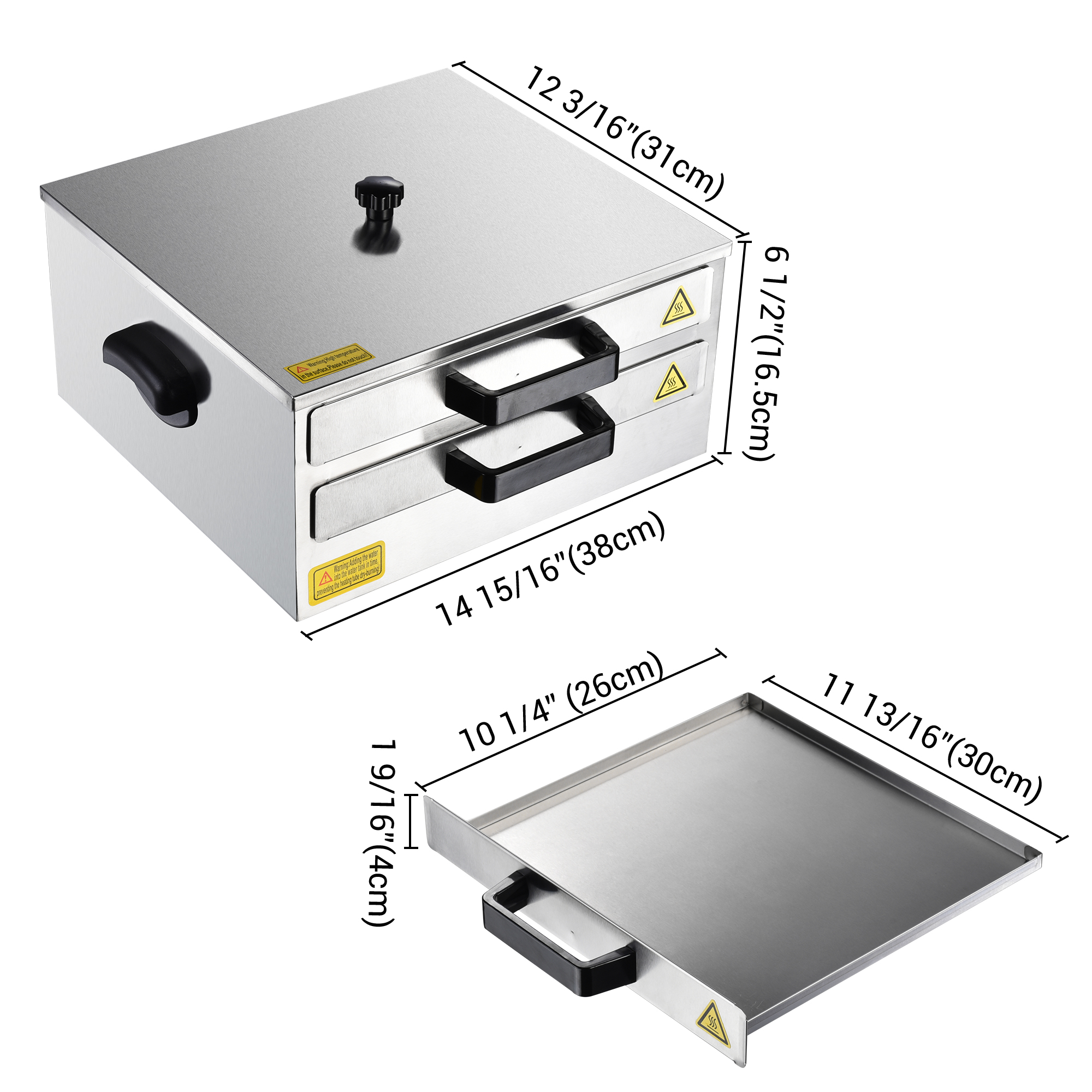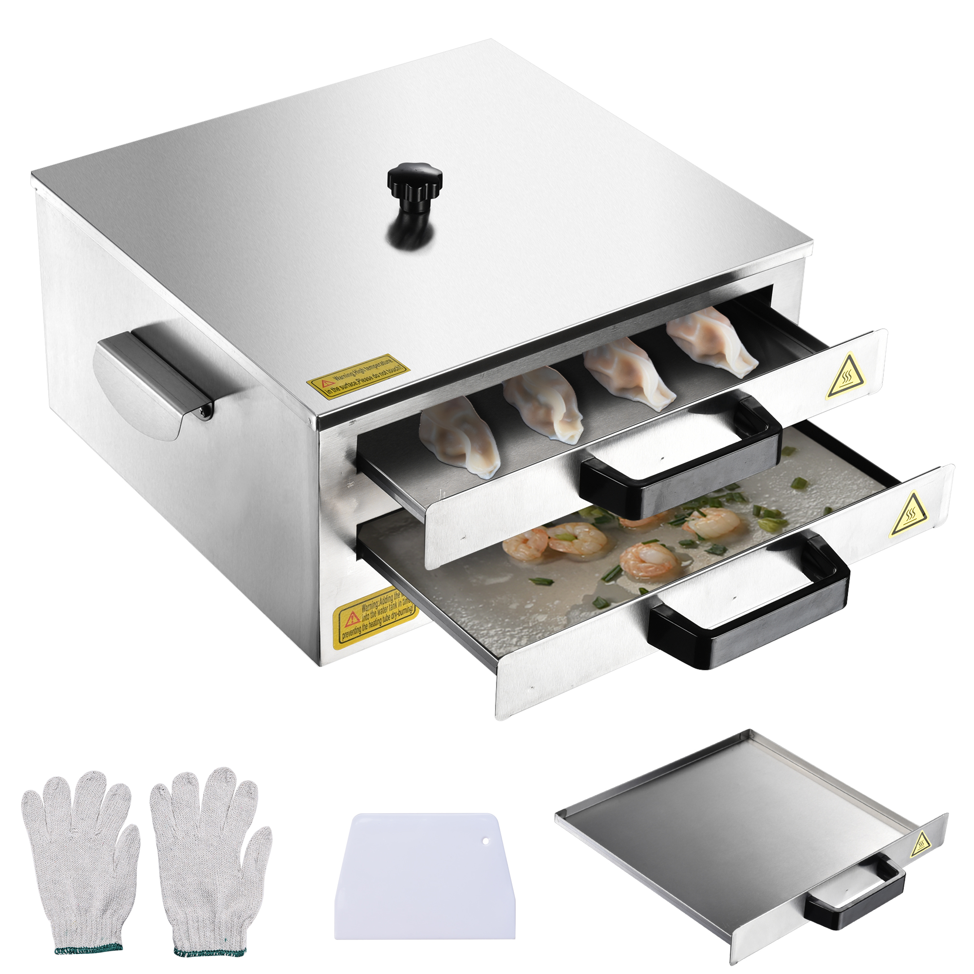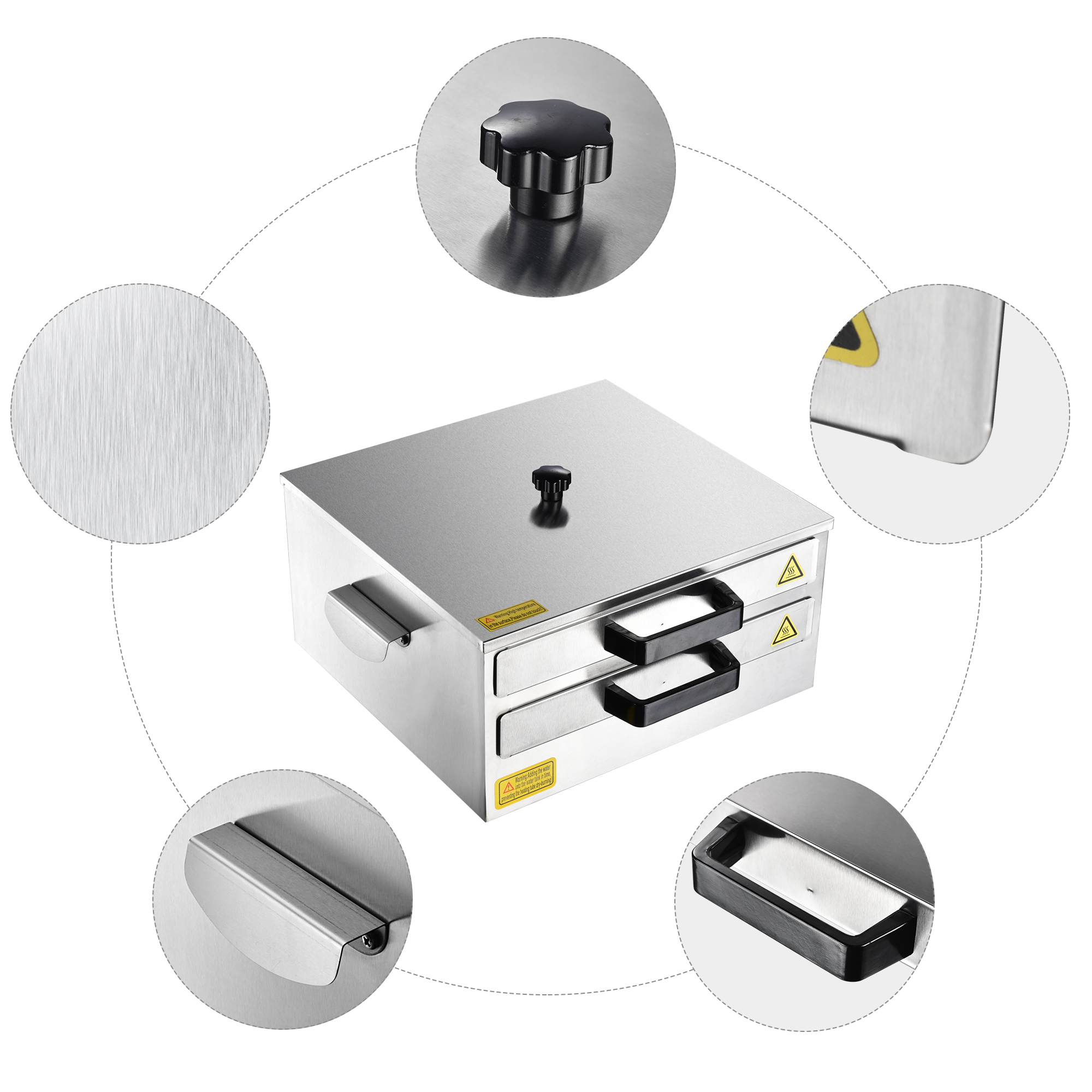 - Food Grade Quality & Safe Protection - Food grade 304 stainless-steel tray for safety, long lifespan and anti-corrosion, extra tray for replacement; Case with edge rounded design avoids cutting hands; Scald-proof plastic handles on trays for easy pulling & thick stainless-steel handles on sides