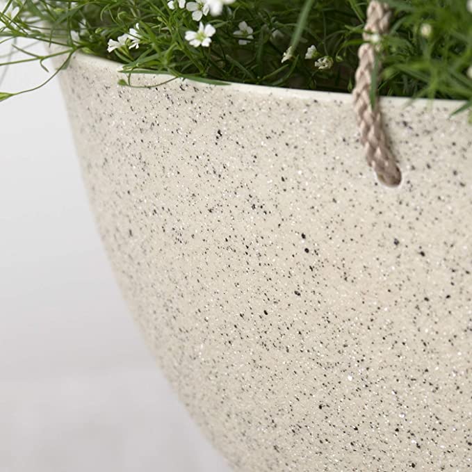 LIGHTWEIGHT MATERIALS AND ADJUSTABLE HOOK - Made from durable recycled plastic and natural stone powder, these plant pots are light enough to hang anywhere outdoors. With the sturdy triple cord hook, the height can be adjusted at will. The concrete-like appearance gives these hanging planters a natural and non-weight bearing look.