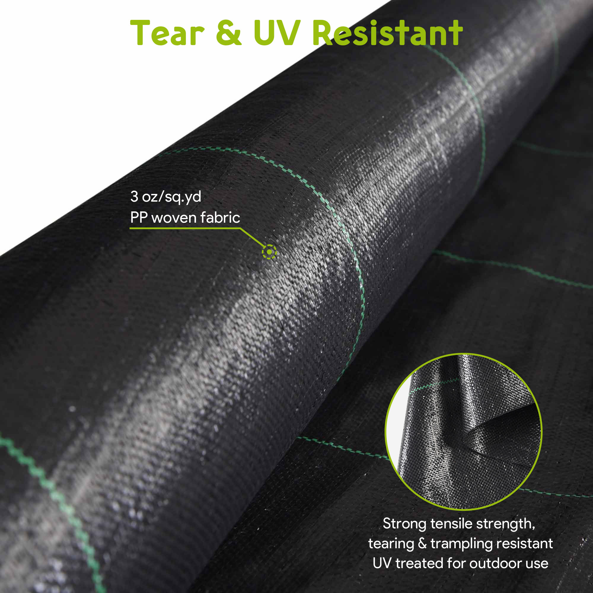 - Tear & UV Resistant - 3 oz/sq.yd woven polypropylene fabric provides strong tensile strength, firm, durable and trampling resistant; UV resistant, not easy to get aging and fading for long time outdoor use