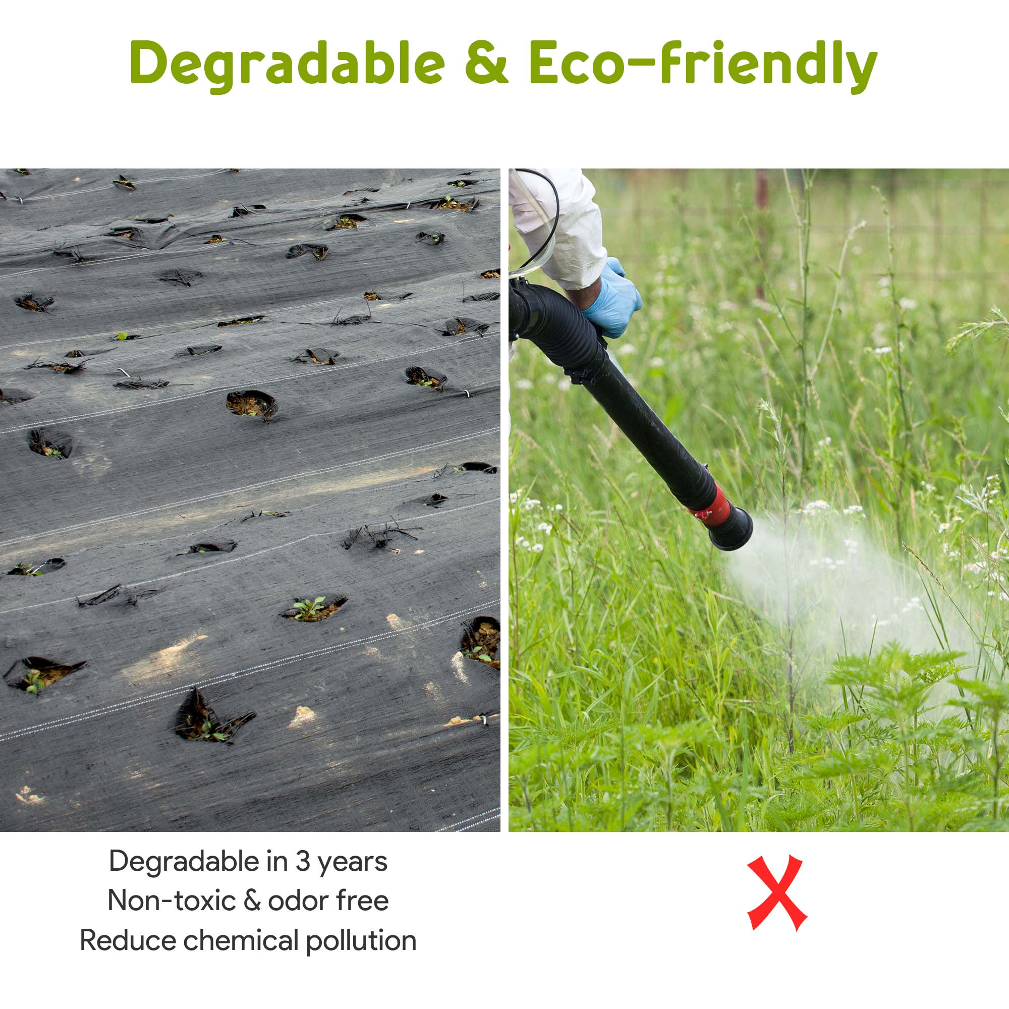 - Degradable & Eco-friendly - Made of degradable plastic which will degenerates into small particles in about 3 years; Non-toxic and odor free, environmentally safe alternative to herbicide use, which reduces chemical pollution for better soil and water conservation