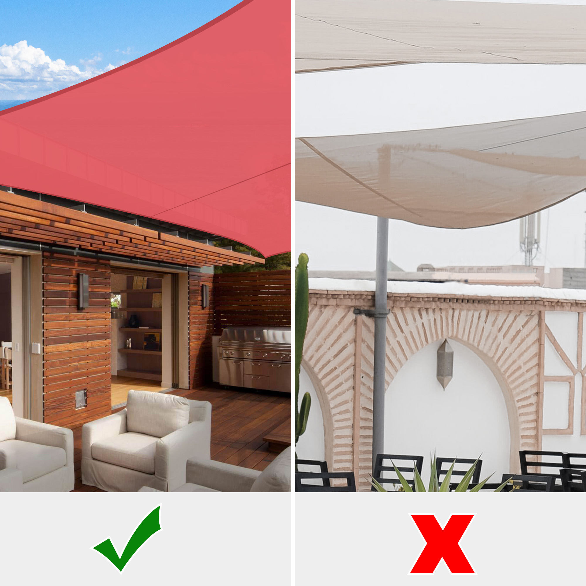 - Durable in Use - Double stitched seam reinforces the edge to prevent fraying and ripping; Curved rectangle shape helps the sail to keep tight; Heavy-duty ropes included; Color fastness of European Level 4 to ensure original color to last for a long time; 2-year warranty for quality issue