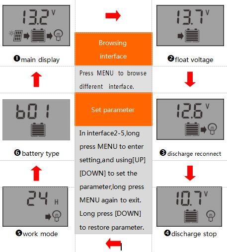 1.Drücken Sie die [Down] -Taste, um das Hauptdisplay manuell ein- und auszuschalten. 2. Der Arbeitsmodus funktioniert wie folgt: [24H] Laden Sie die Ausgabe 24 Stunden [1-23H] wird nach Sonnenuntergang geladen und nach dem Einstellen der Stunden geschlossen [0H] Dämmerung bis zum Morgengrauen |
