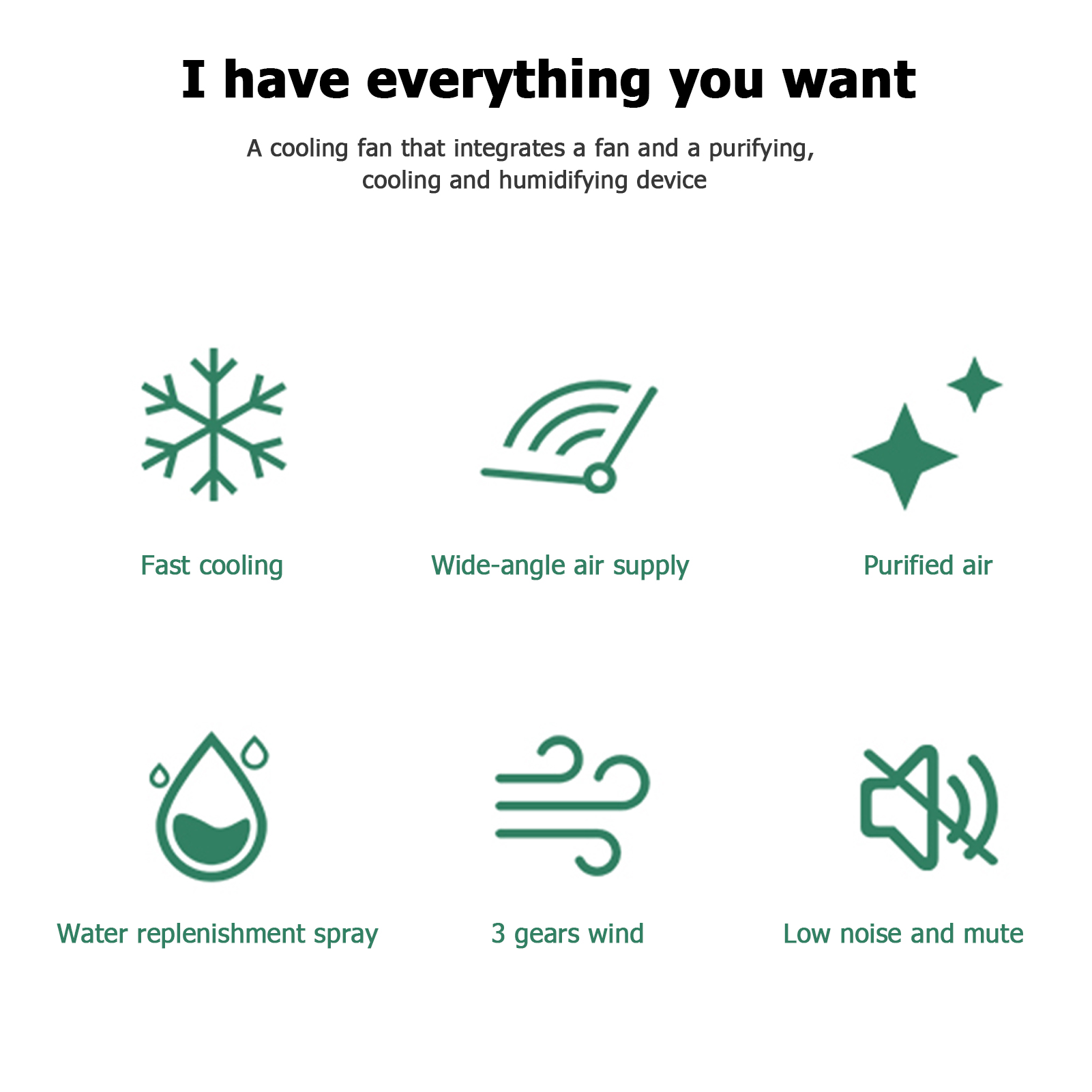 1. Three-level adjustable wind speed: soft wind speed + mid-range wind speed + strong wind speed. Adults and children are available. Three-in-one function: strong cold air + spray humidification + air purification.